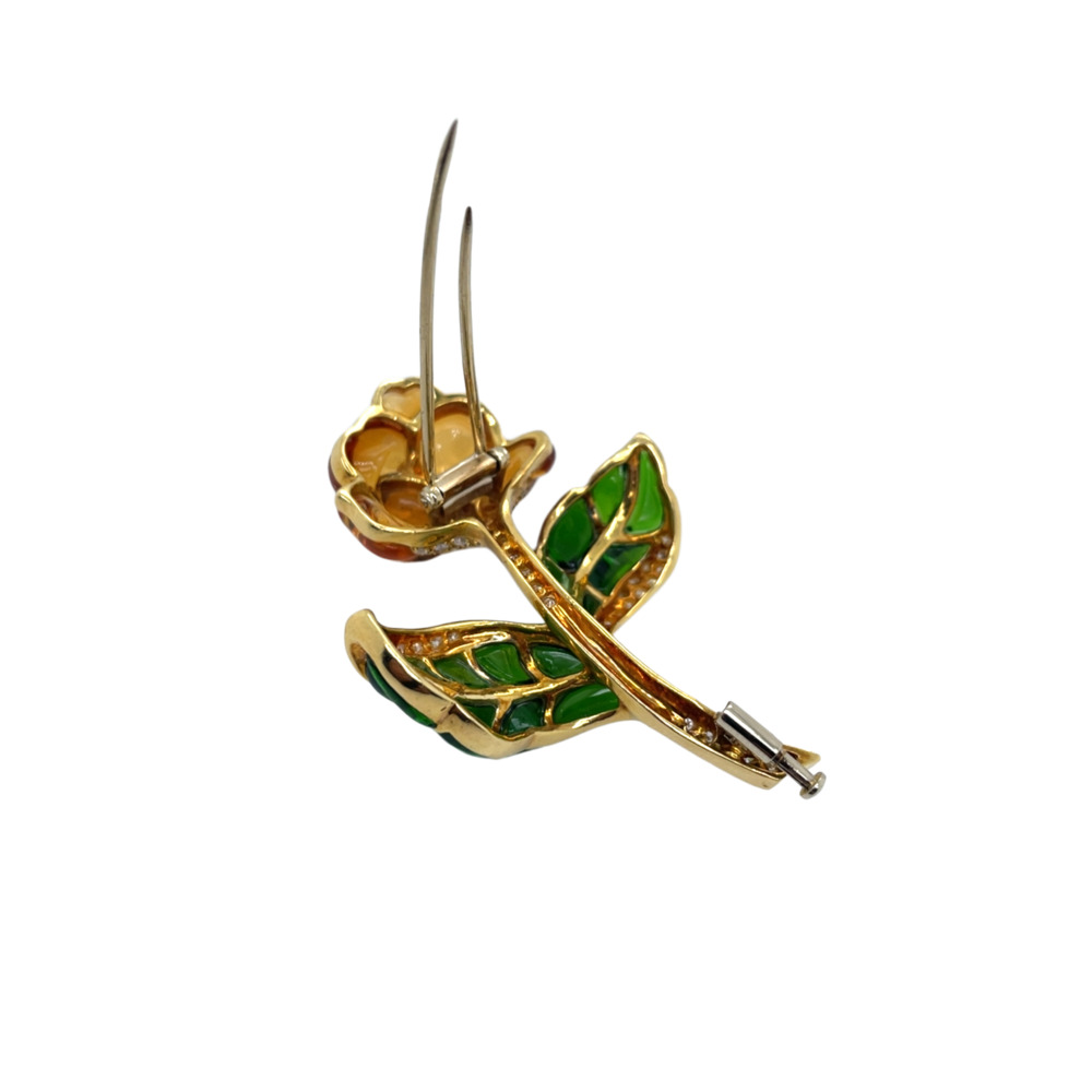 The flower motif features a carved citrine flower and carved green tourmaline leaves, pavé-set with 79 small round brilliant-cut diamonds weighing 1.50 carats total, measuring 2 ¼ inches.