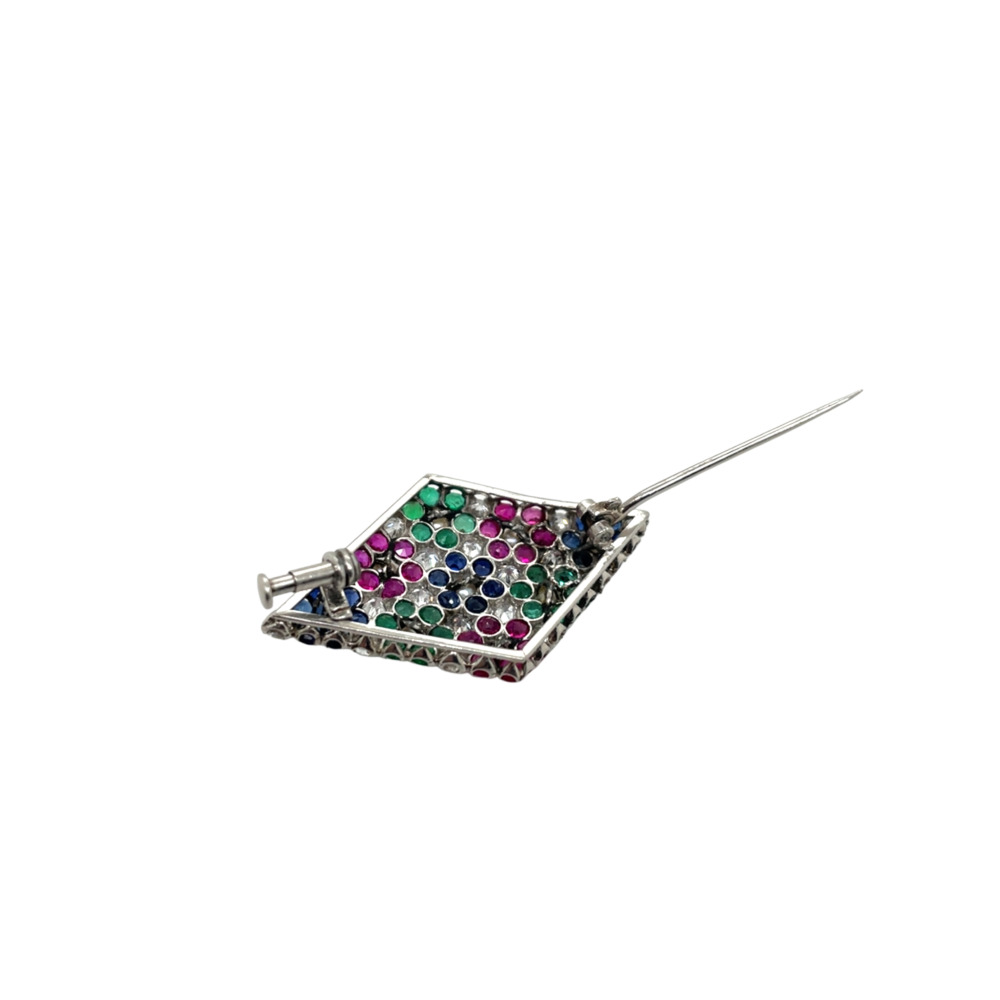 The diamond-shaped shield is pavé set with clusters of old-cut emeralds, rubies, sapphires, small natural pearls, and old mine-cut diamonds, weighing approximately 1.44 carats total, and measures 1 5/8 inches long.