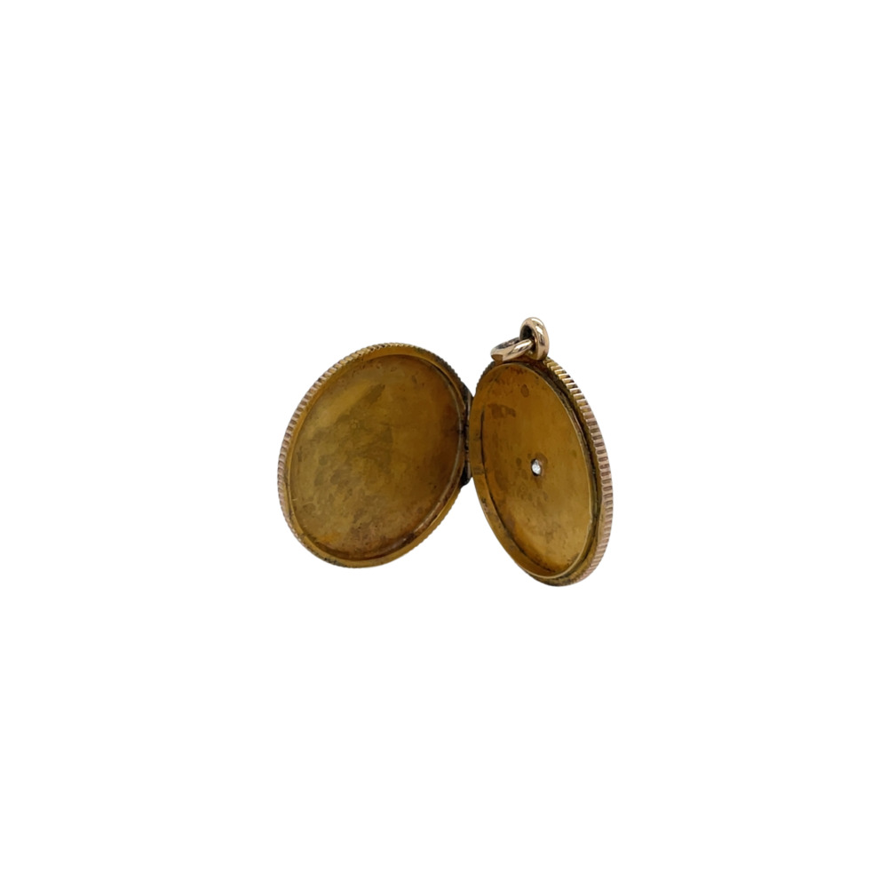 The round locket measures 25mm, with an engraved top and set with one small old mine-cut diamond weighing approximately 0.05 carat.Circa 1900s