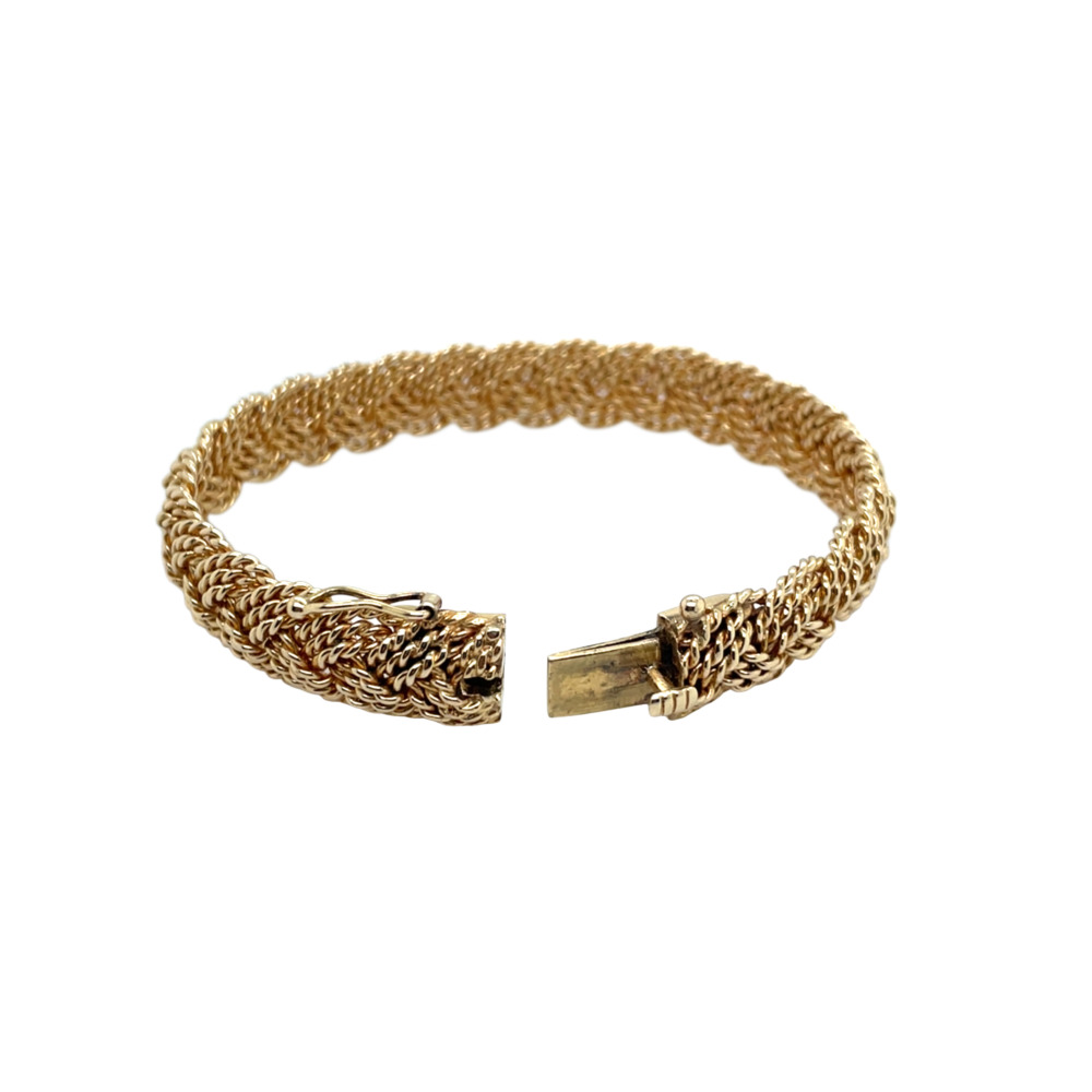 The braided motif bangle measures 10.5mm wide and approximately 6 ¾ inches in wrist size.