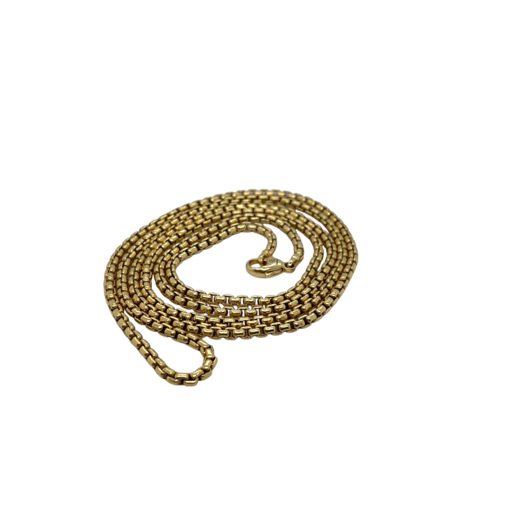 The round box-style chain, measuring 2.7 dwt and 30 inches long, weighs 22.8 dwts. -