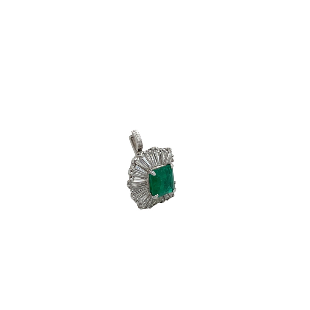 The ballerina-style set features one square emerald cut emerald measuring 7.8 x 7.6mm, weighing approximately 2.25 carats, surrounded by baguette-cut diamonds weighing approximately 2.0 carats in total.