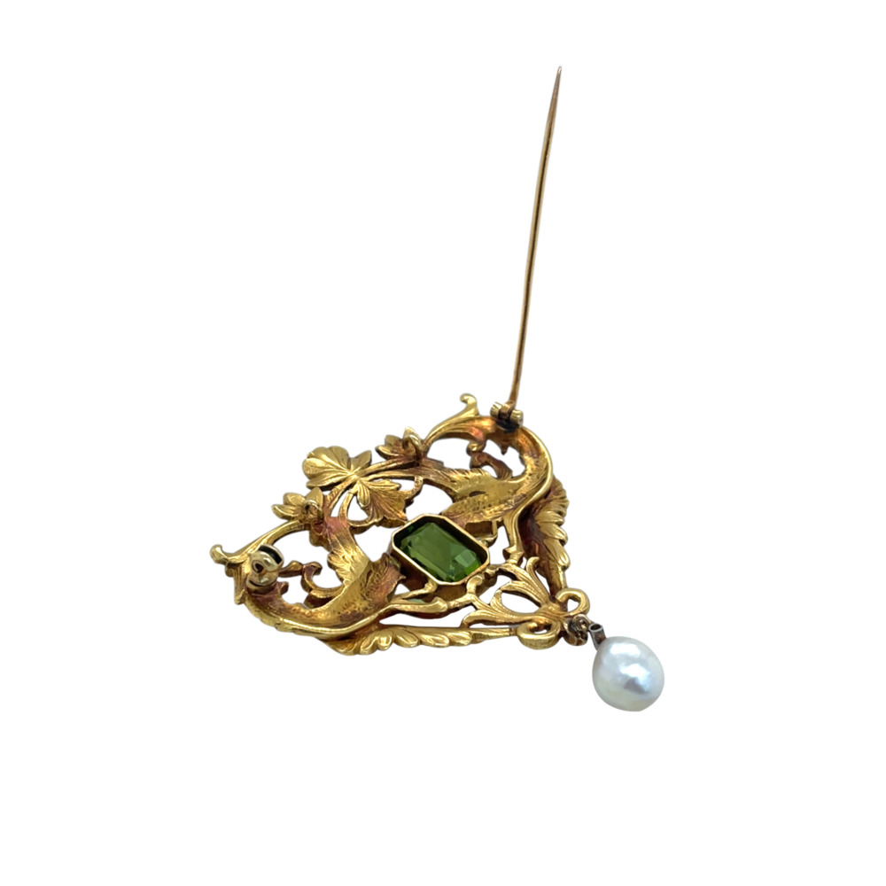 Art Nouveau 18K Yellow Gold Peridot and Pearl Brooch