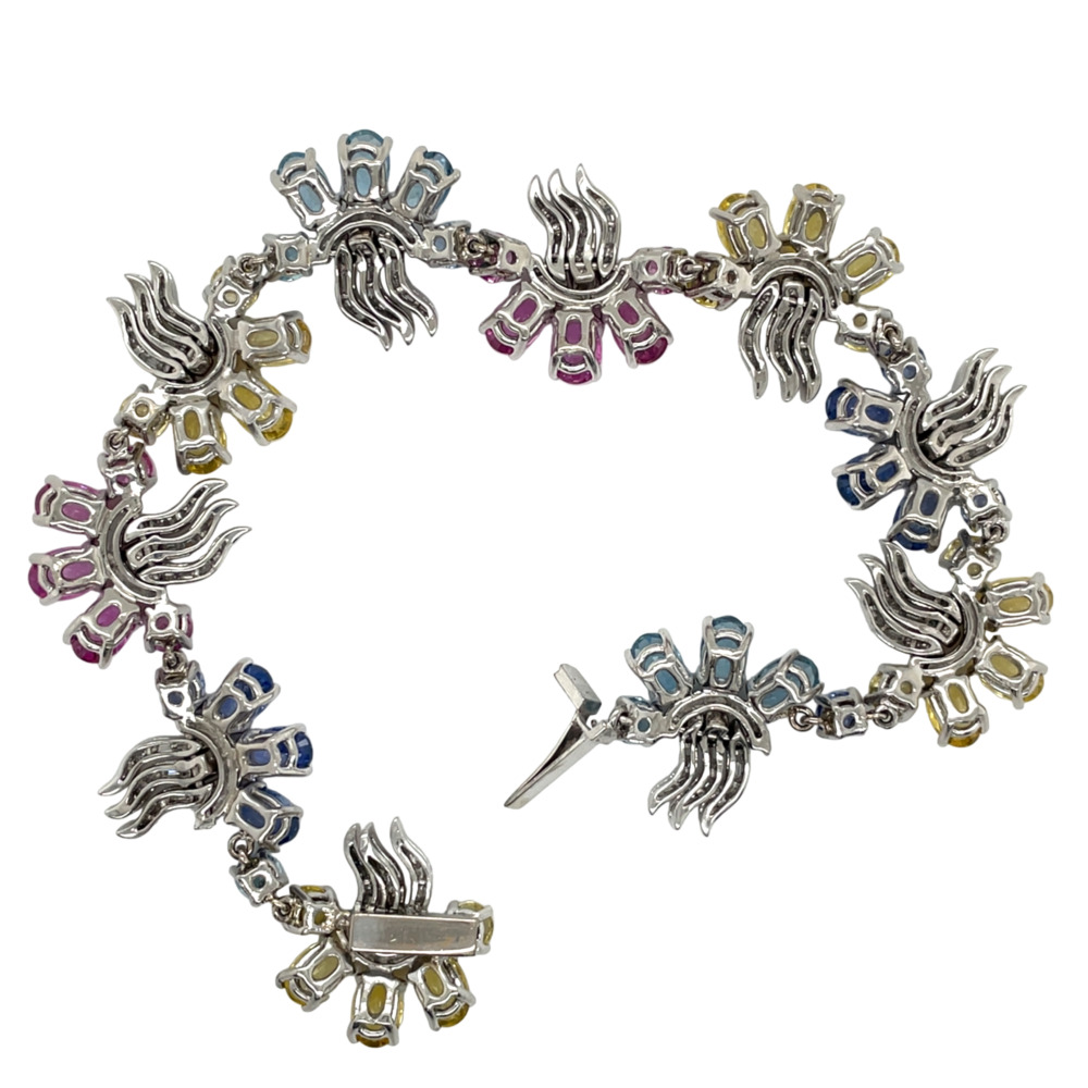 The flexible floral-style link set features oval-shaped pink, blue, and yellow sapphires measuring 6x4mm, weighing approximately 35 carats total, and small round and baguette-cut diamonds weighing approximately 3.0 carats total.