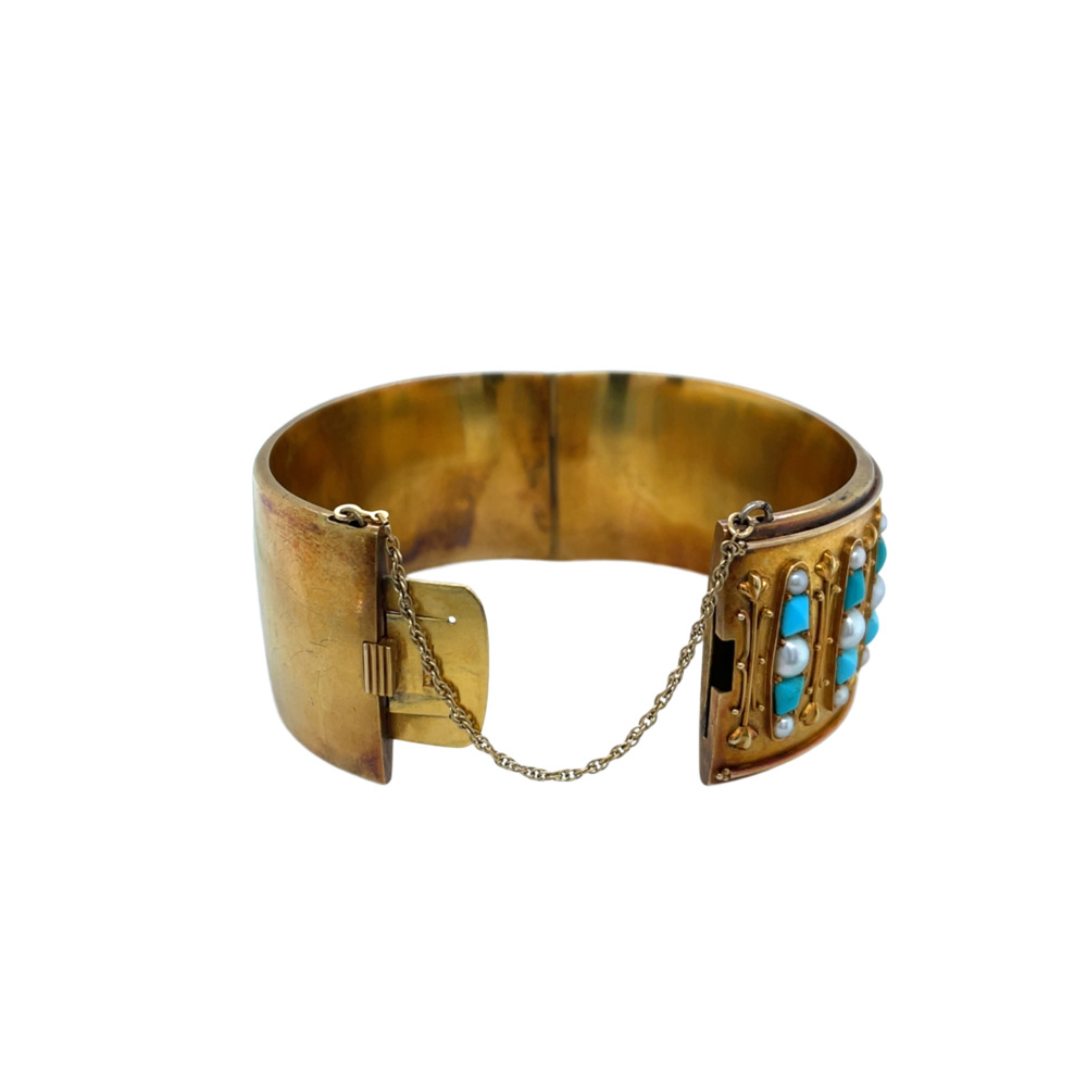 The wide Etruscan style set with calibre cut turquoise and alternated by half seed pearls, measuring 1 ¼ inches wide and 6 ¾ inches wrist size.