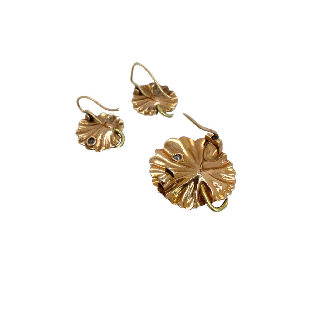 Victorian 14K Yellow Gold Diamond Lotus Leaf Set