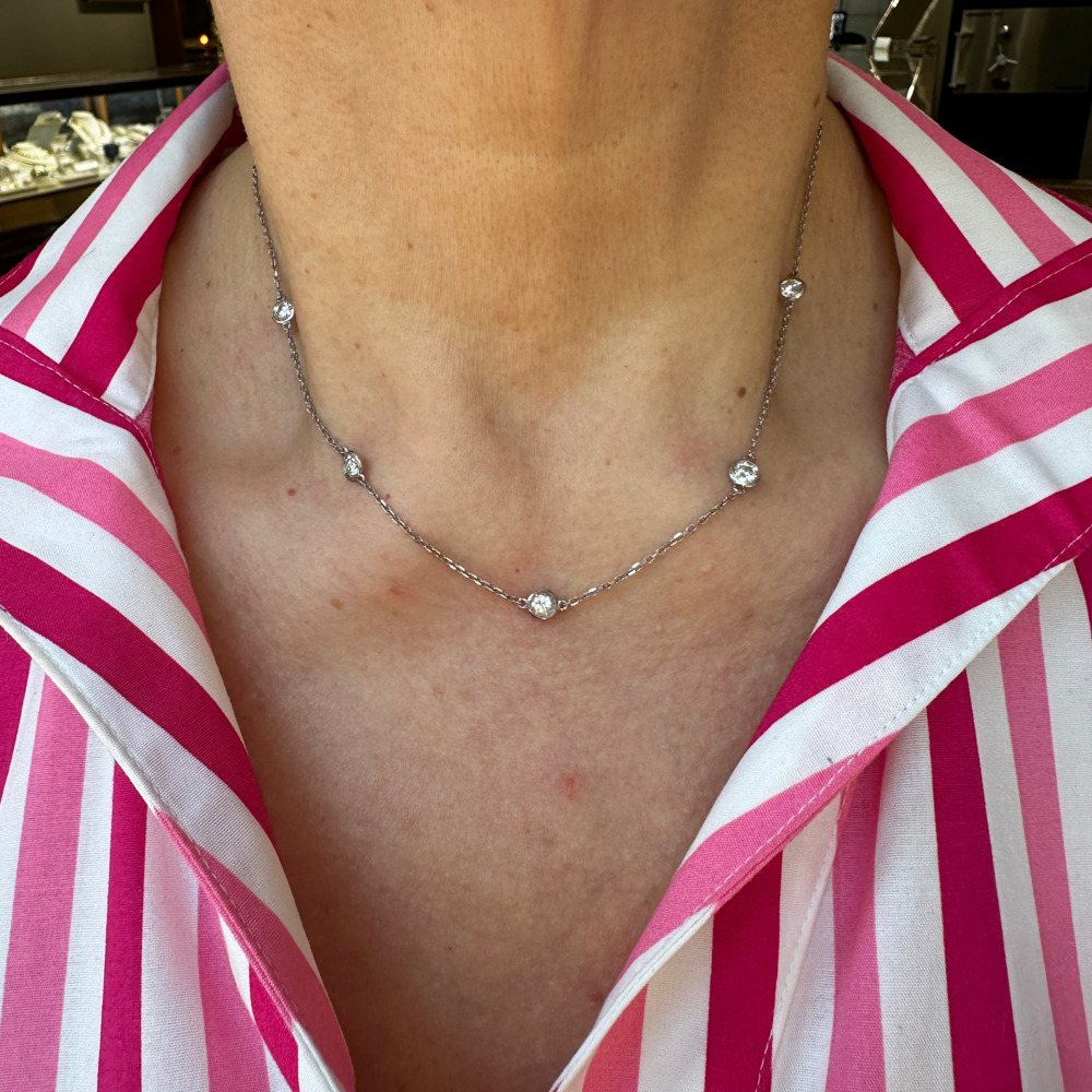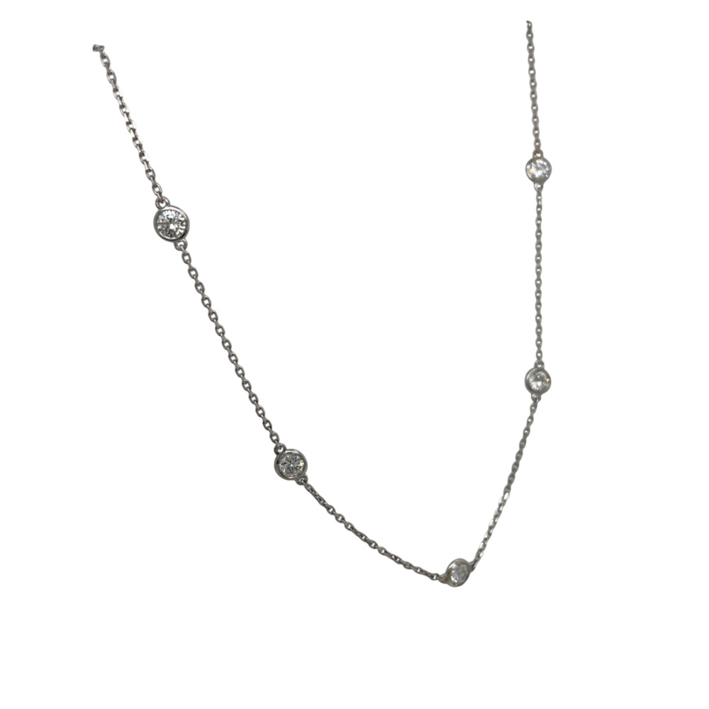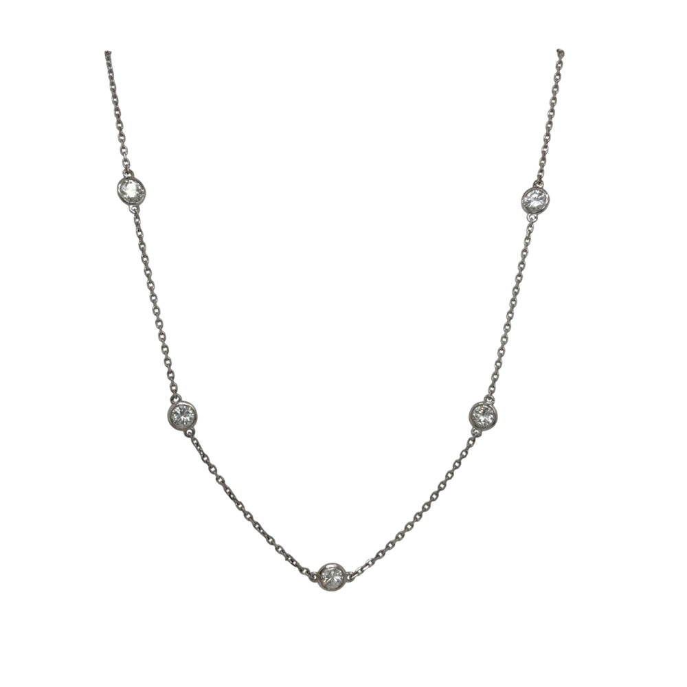 Bezel set with 5 round brilliant cut diamonds weighing approximately 1.00 carat total, measuring 16 inches long.