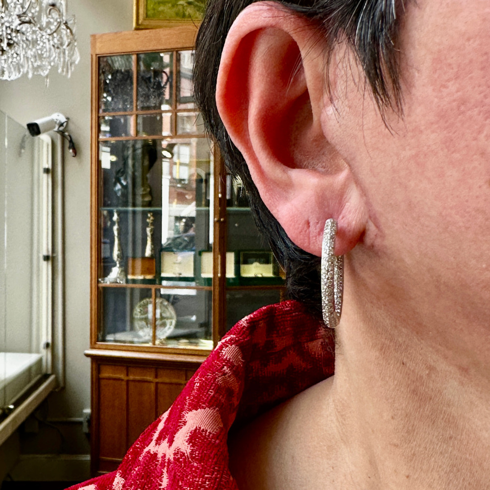 The hammer finish X motif earring set with 100 small round brilliant cut diamonds weighing approximately 1.0 carat total. The earring measuring 23 x 23mm and weighing 14.2 dwts.Color: G – H