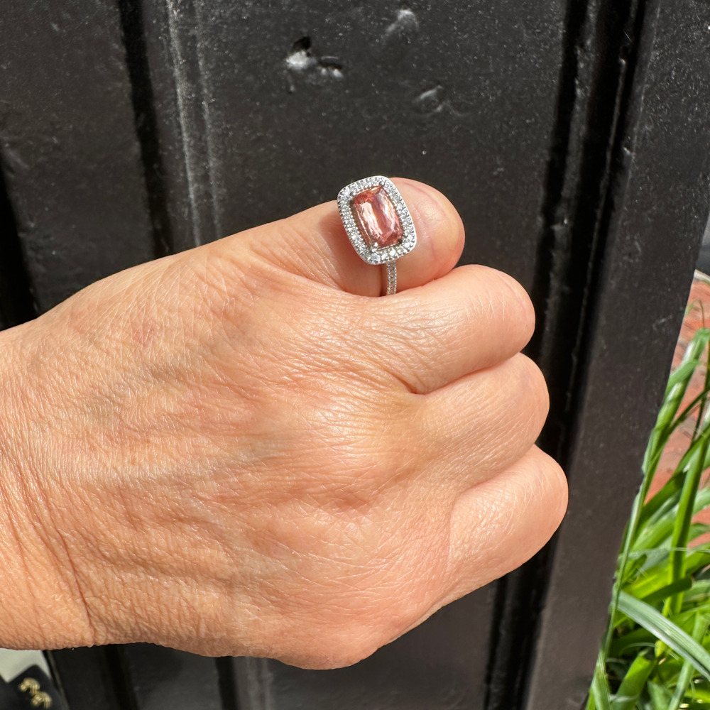 The cluster micro pave style set with one cushion cut imperial topaz weighing approximately 1.90 carats, surrounded by small round brilliant cut diamonds weighing approximately 0.38 carats total.