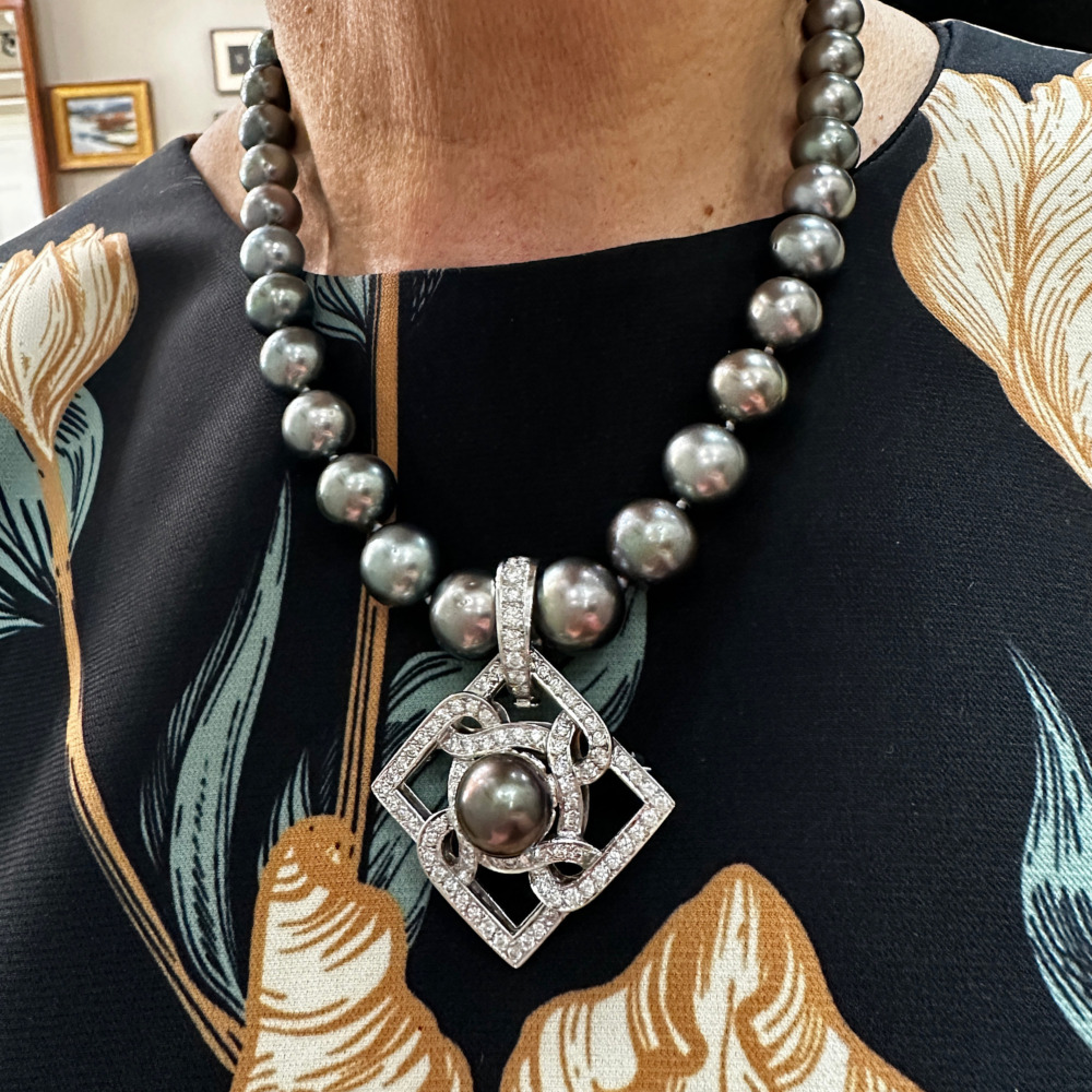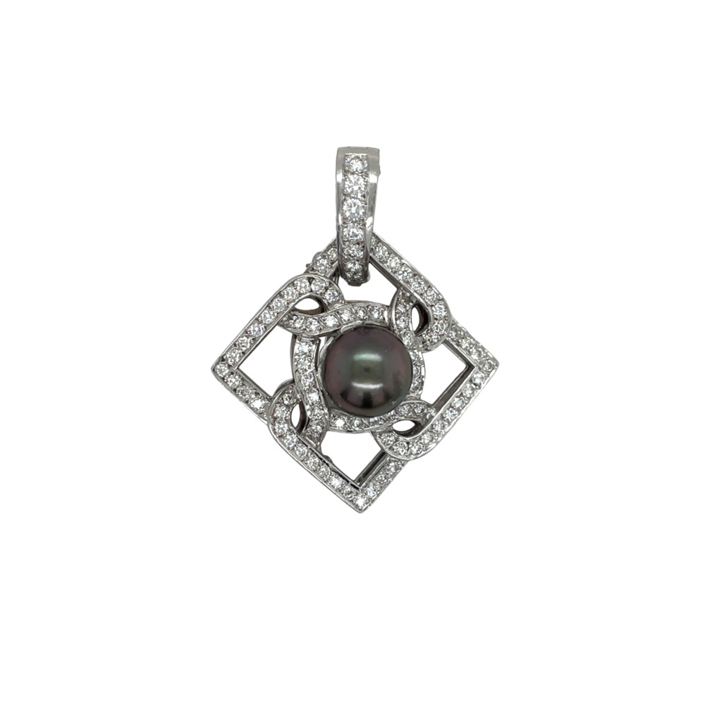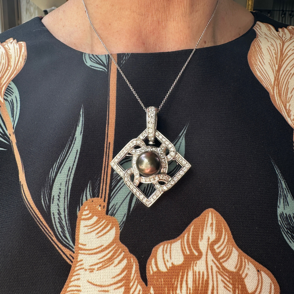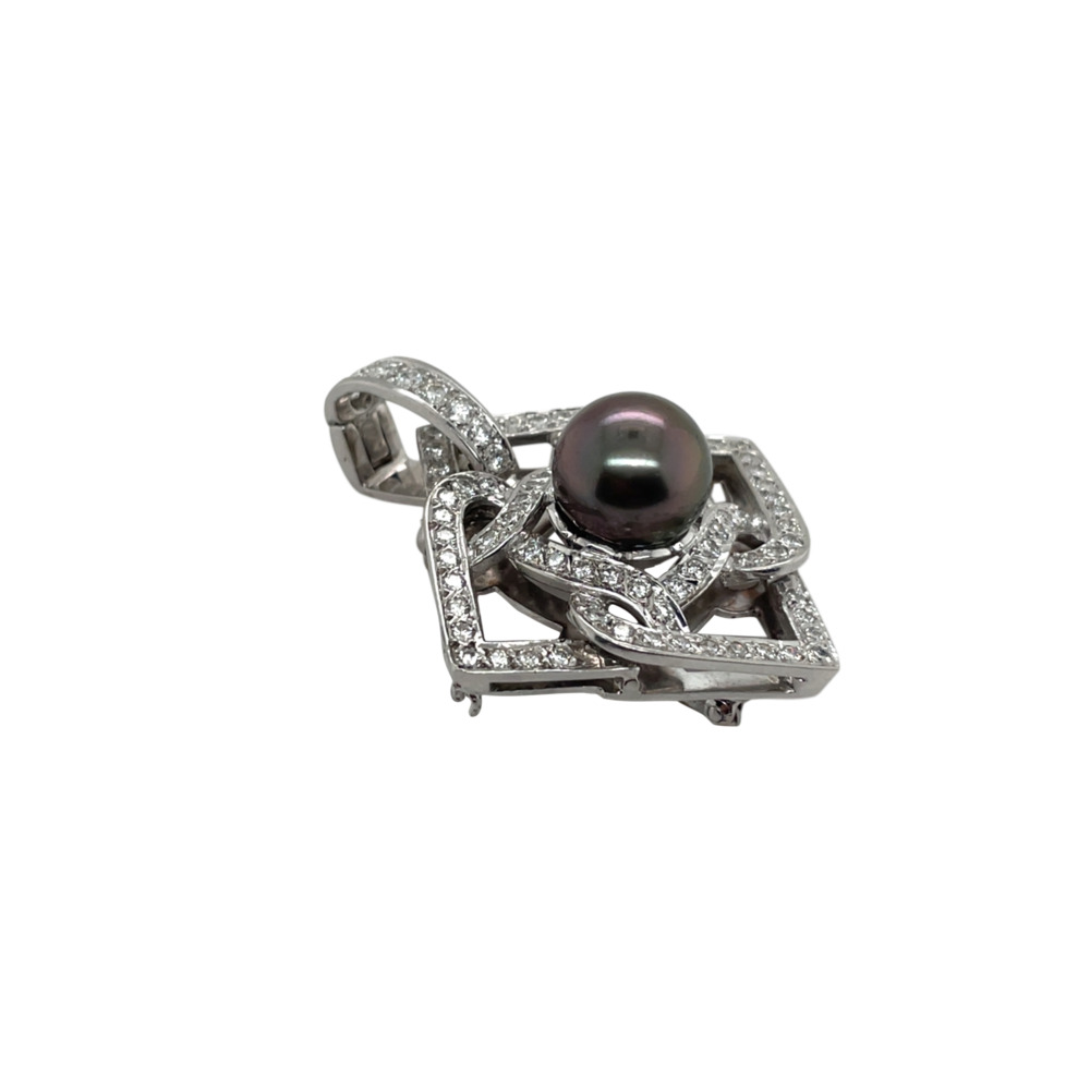 The open-work, square-shaped brooch is set with one black Tahitian cultured pearl measuring 12mm and surrounded by small round brilliant-cut diamonds weighing approximately 2.0 carats, totaling 14.3 dwts.