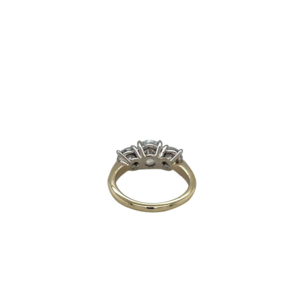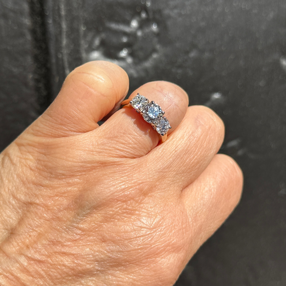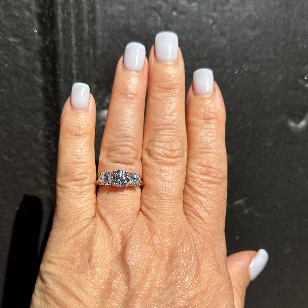 The three-stone prong style set with one round brilliant cut diamond weighing 1.30 carats with a GIA report number 1232650525, flanked by two round brilliant cut diamonds weighing 0.70 carats with a GIA report number 1126888662, 0.70 carats with a GIA report number 1378644416.