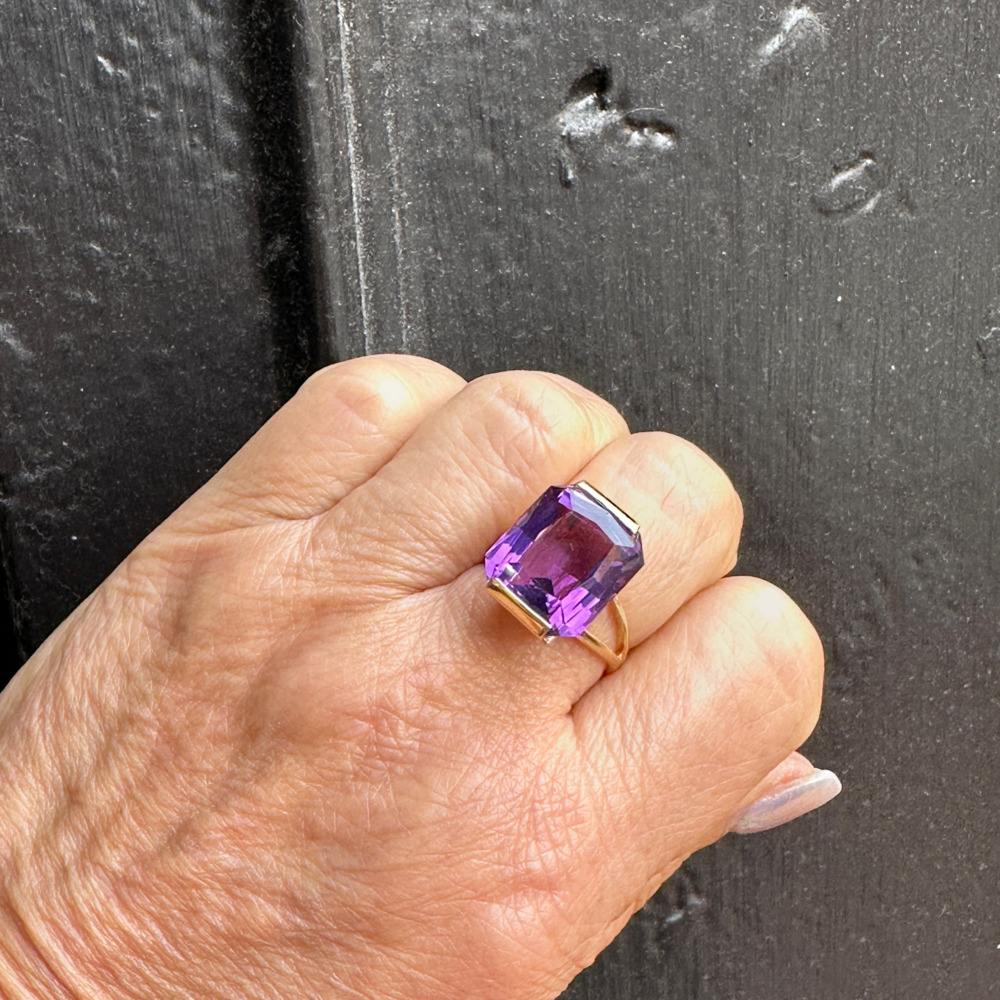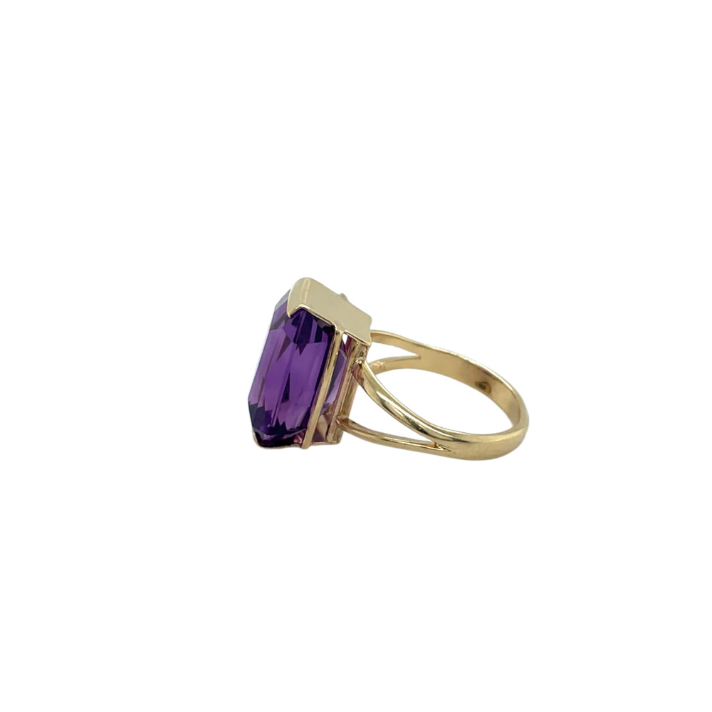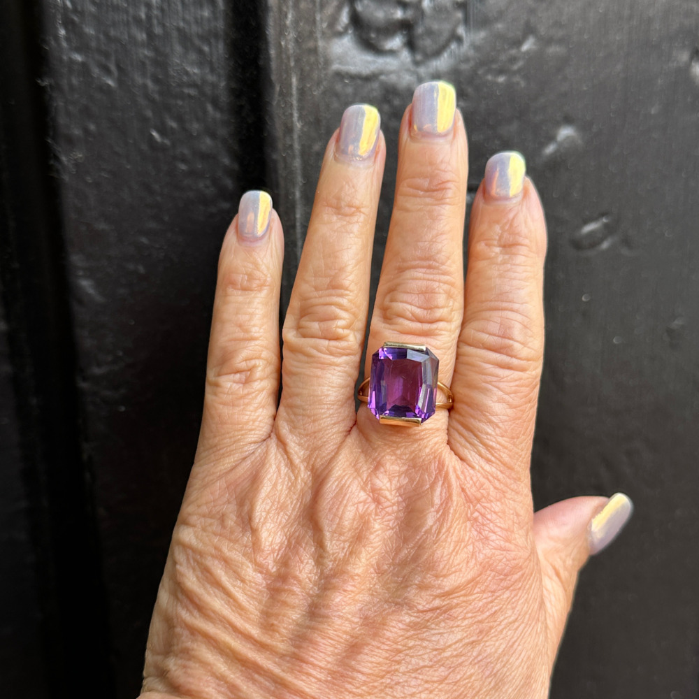 The solitaire-style set features one emerald-cut amethyst measuring 15 x 13mm.