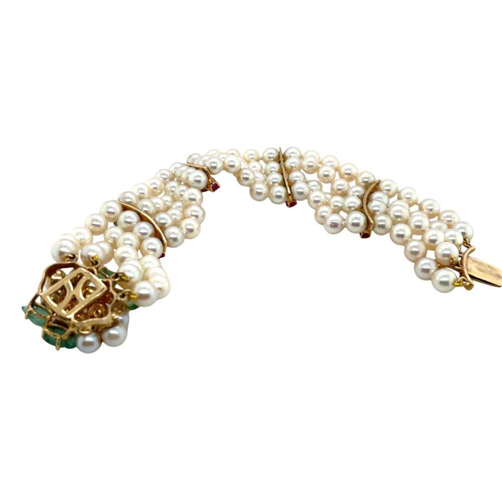 The four-row style is composed of 100 cultured pearls measuring 5.5mm, with 4 dividers set with carved emeralds and round rubies, finished with small pearls, carved emeralds, sapphires, and rubies.Circa 1950s