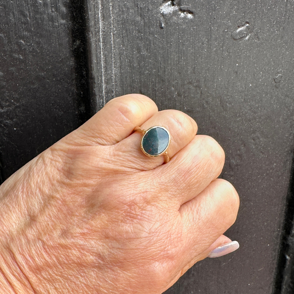 Bezel set with one oval-shaped bloodstone measuring 13 x 10.5mm.
