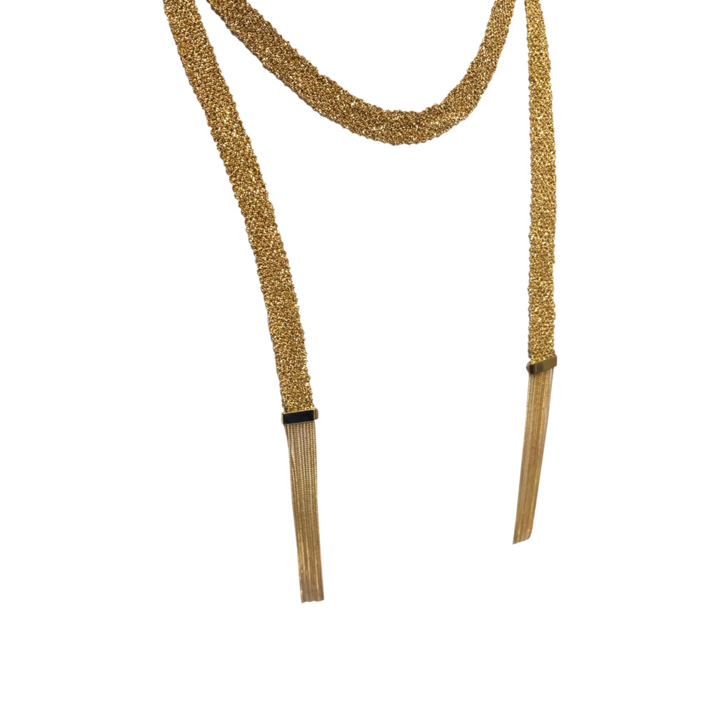 The fabric-like mesh measuring 3/8 inch wide and 34 inches long with tassel ends.