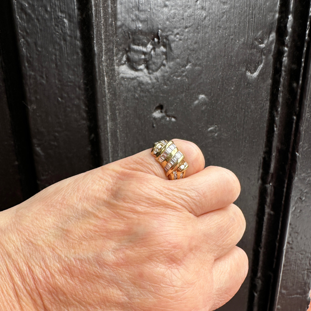 The twist-style double row set on top features 15 baguette-cut diamonds and is flanked by 22 round brilliant-cut diamonds weighing approximately 1.50 carats total.