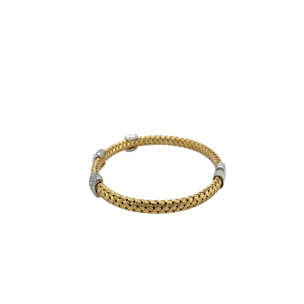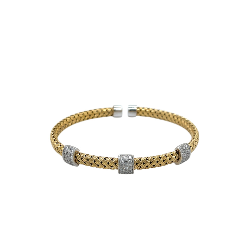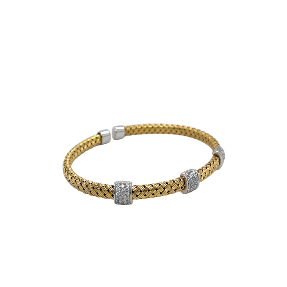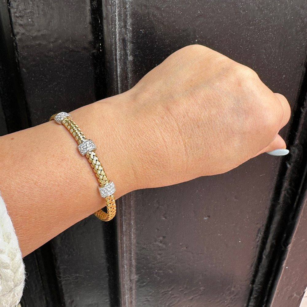 The mesh-style bangle with three sections of small pavé-cut diamonds weighing approximately 0.75 carats total, measuring 5mm wide.
