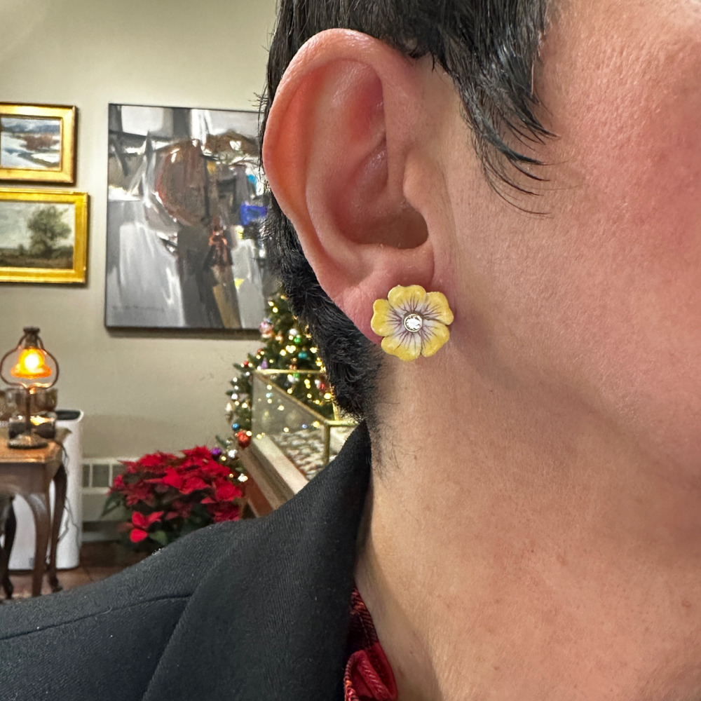 14K Yellow Gold Enamel and Diamond Pansy Earrings