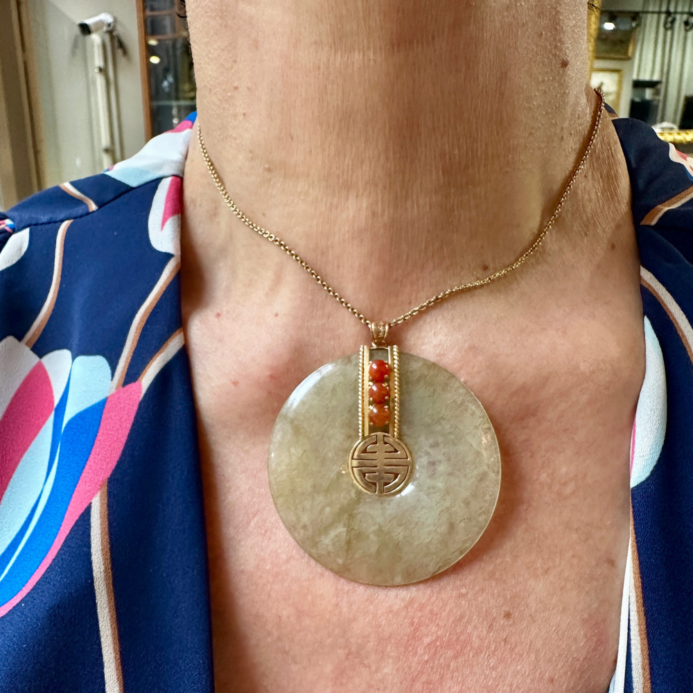 The large jade disc, measuring approximately 2 ¼ inches, is set with three round cabochon-cut carnelian stones.