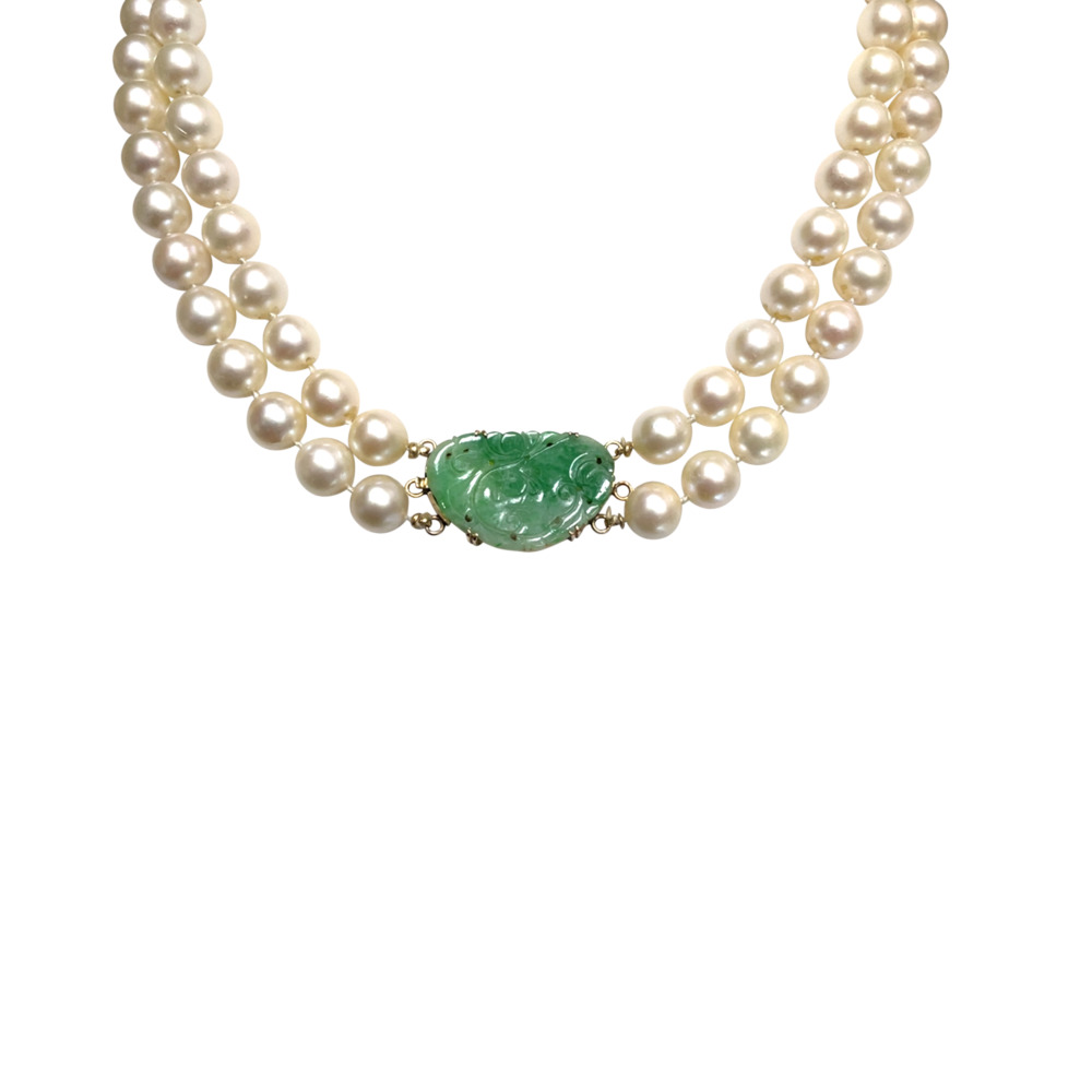 The double strand composed of 80 cultured saltwater Akoya pearls measuring 8.5 – 8.9mm and 15.5inches long, finished with a carved jade clasp.