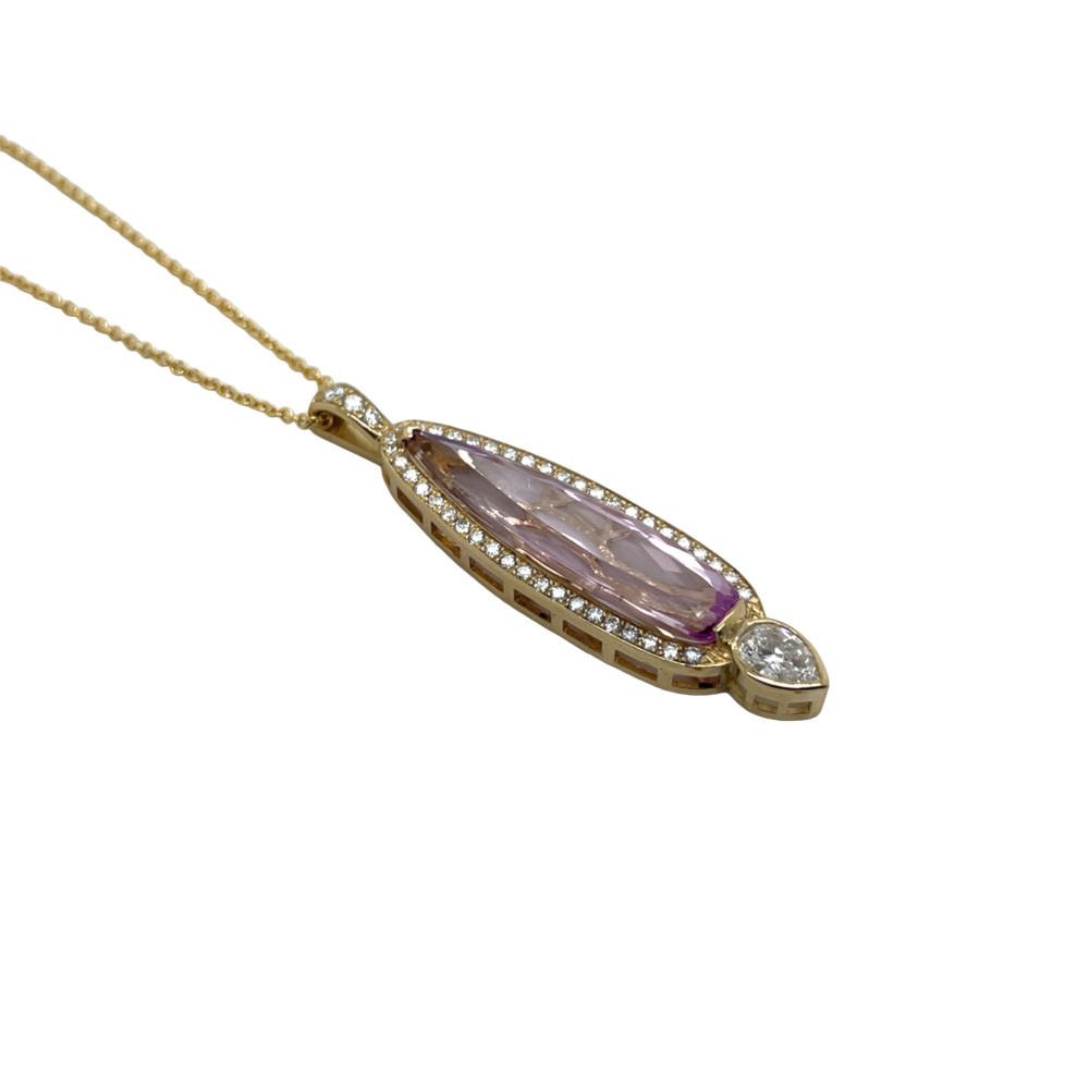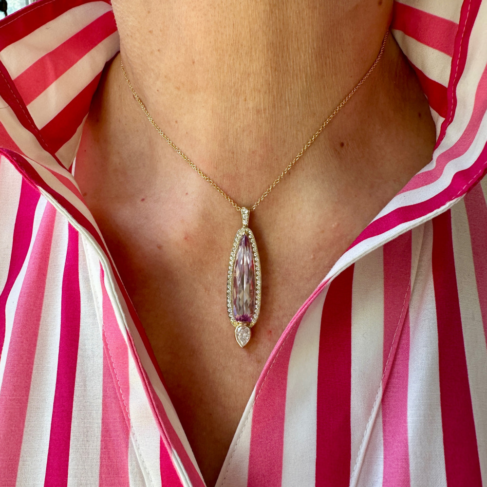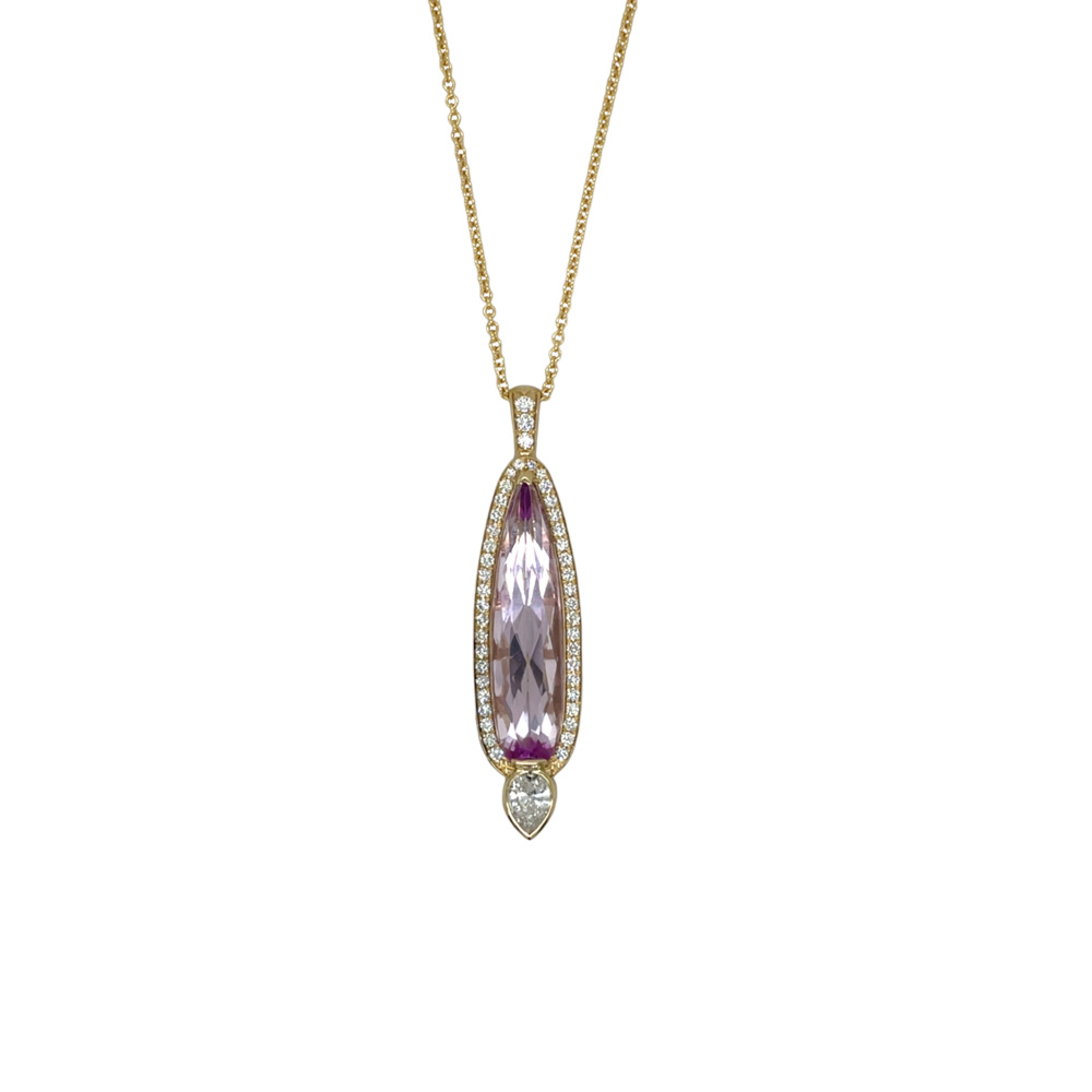 The custom-made setting is set with one pear-shaped Kunzite measuring 28.4 x 7.16mm, weighing 7.68 carats, bezel set with one pear-shaped diamond weighing 0.41 carat and surrounded by 45 small round brilliant cut diamonds weighing 0.71 carat total.