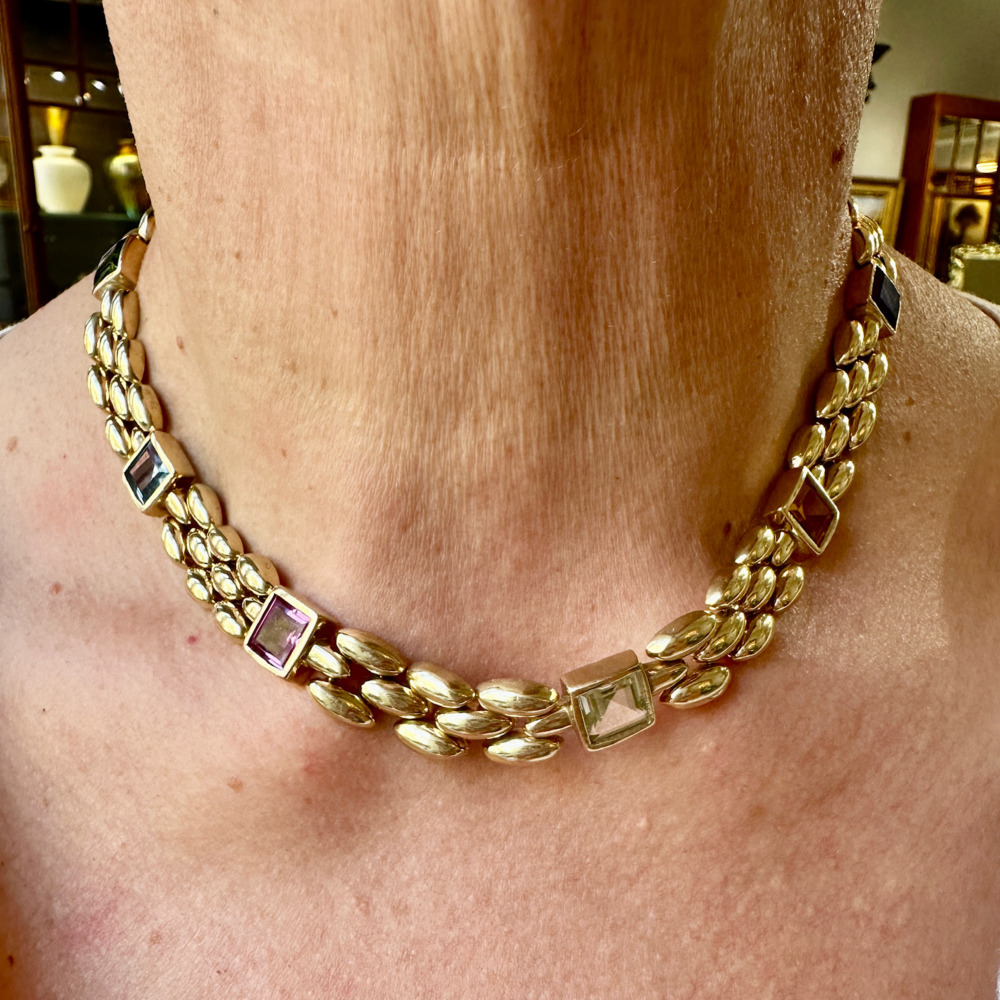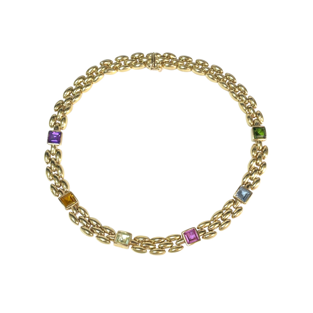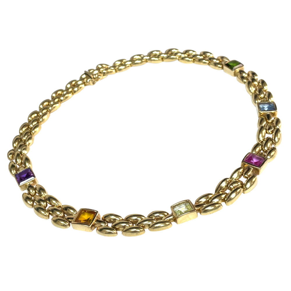 The panther-style links set with square-cut amethyst, citrine, peridot, tourmaline, and topaz, measuring 11.7mm wide and 16.5 inches long, and weighing 36.3 dwts.