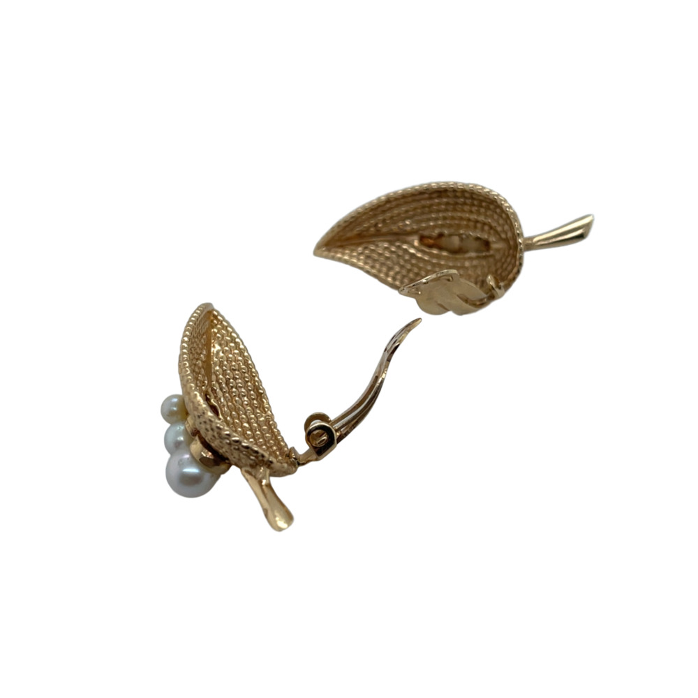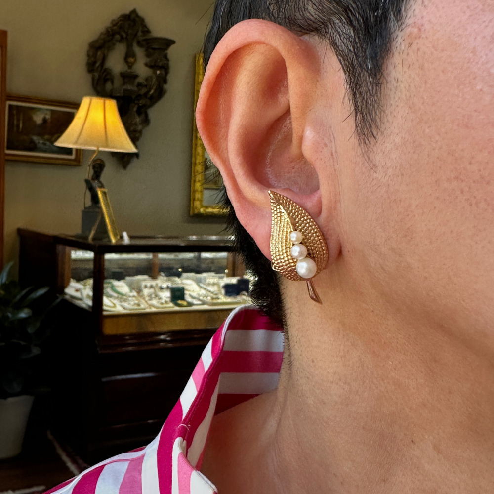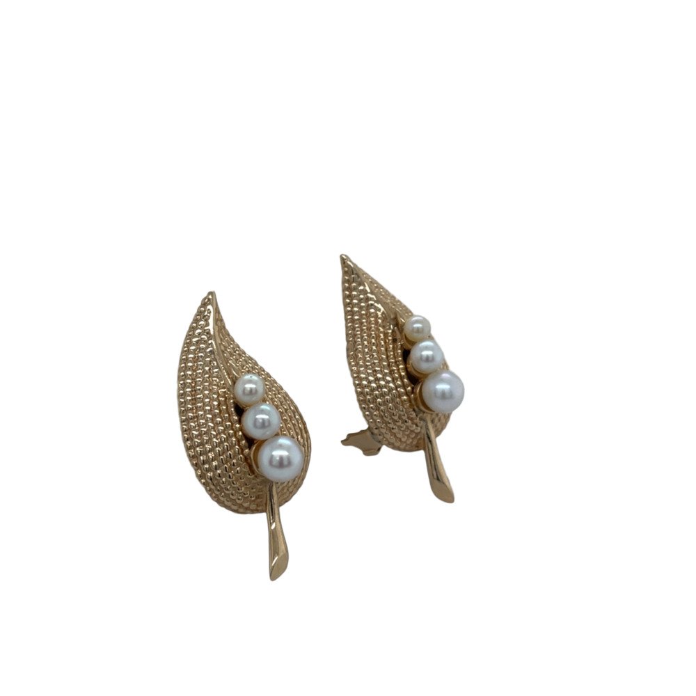 The leaf motif is set with 6 graduated cultured pearls measuring from 3.5 -5.0mm, measuring 1 1/2 x 5 inches.