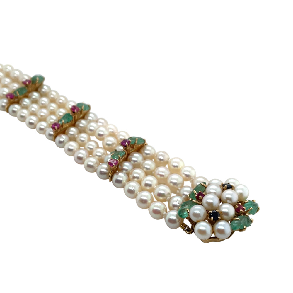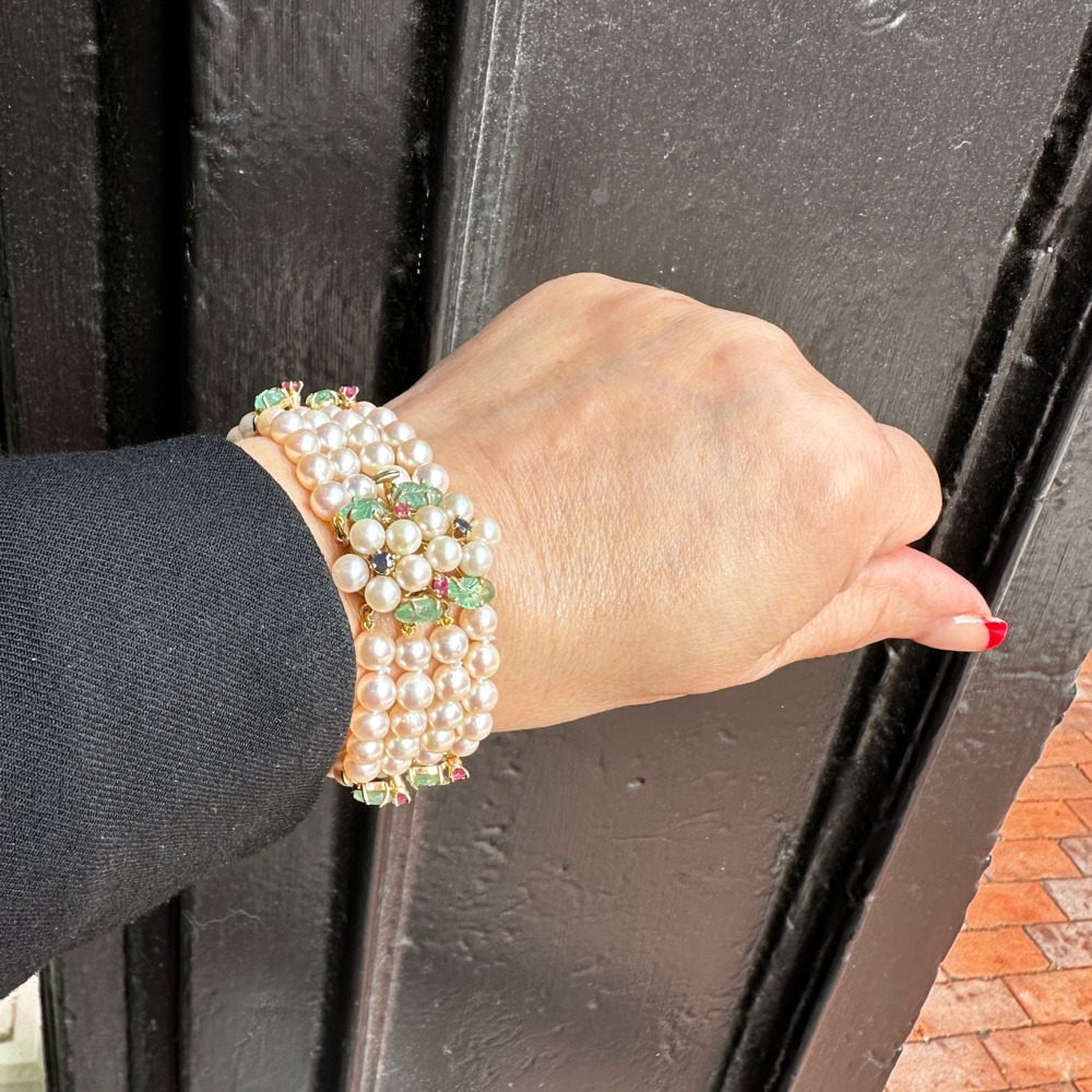 The four-row style is composed of 100 cultured pearls measuring 5.5mm, with 4 dividers set with carved emeralds and round rubies, finished with small pearls, carved emeralds, sapphires, and rubies.