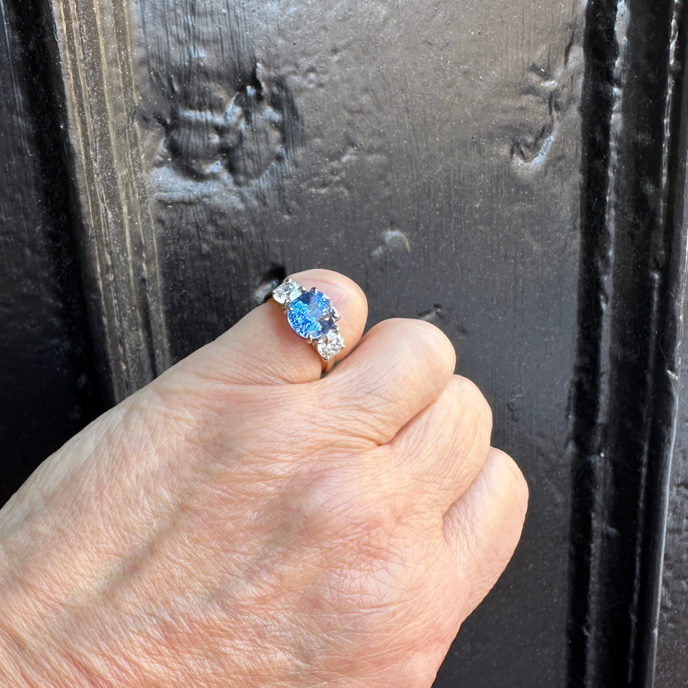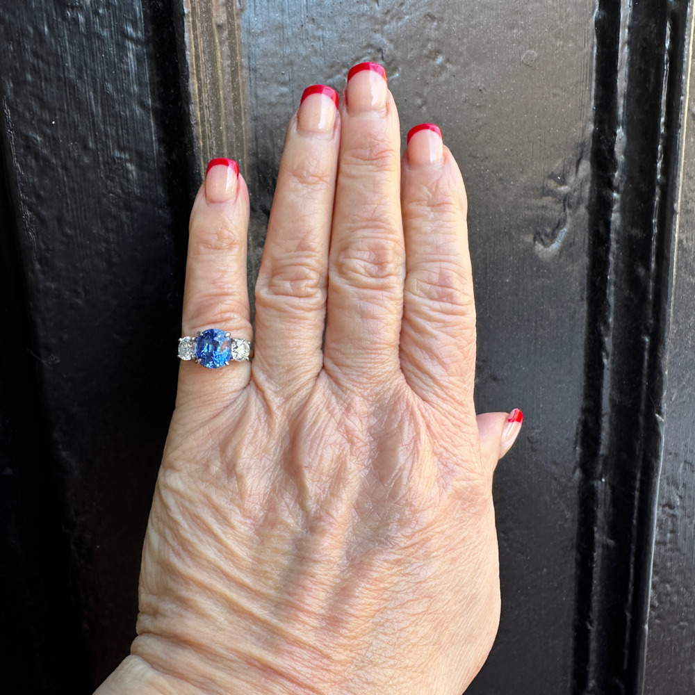 The three-stone set with one oval-shaped sapphire weighing 3.85 carats, flanked by two round brilliant-cut diamonds weighing approximately 1.20 carats total.
