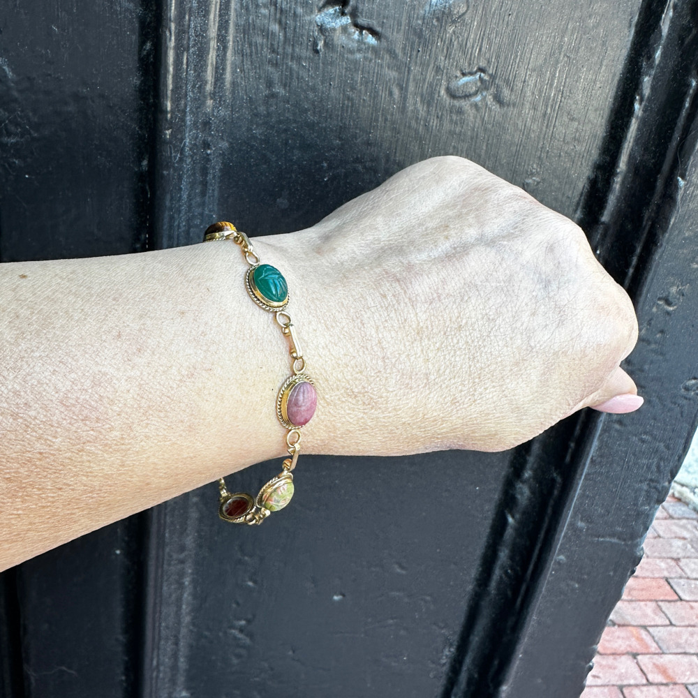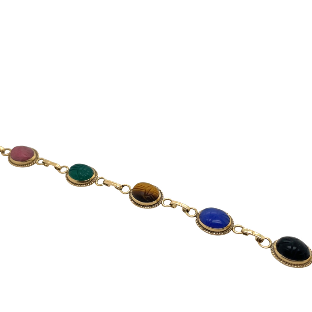 Composed of 7 oval-shaped multi-colored carved hard stones measuring 10 x 8mm, measuring 7 ¾ inches long.