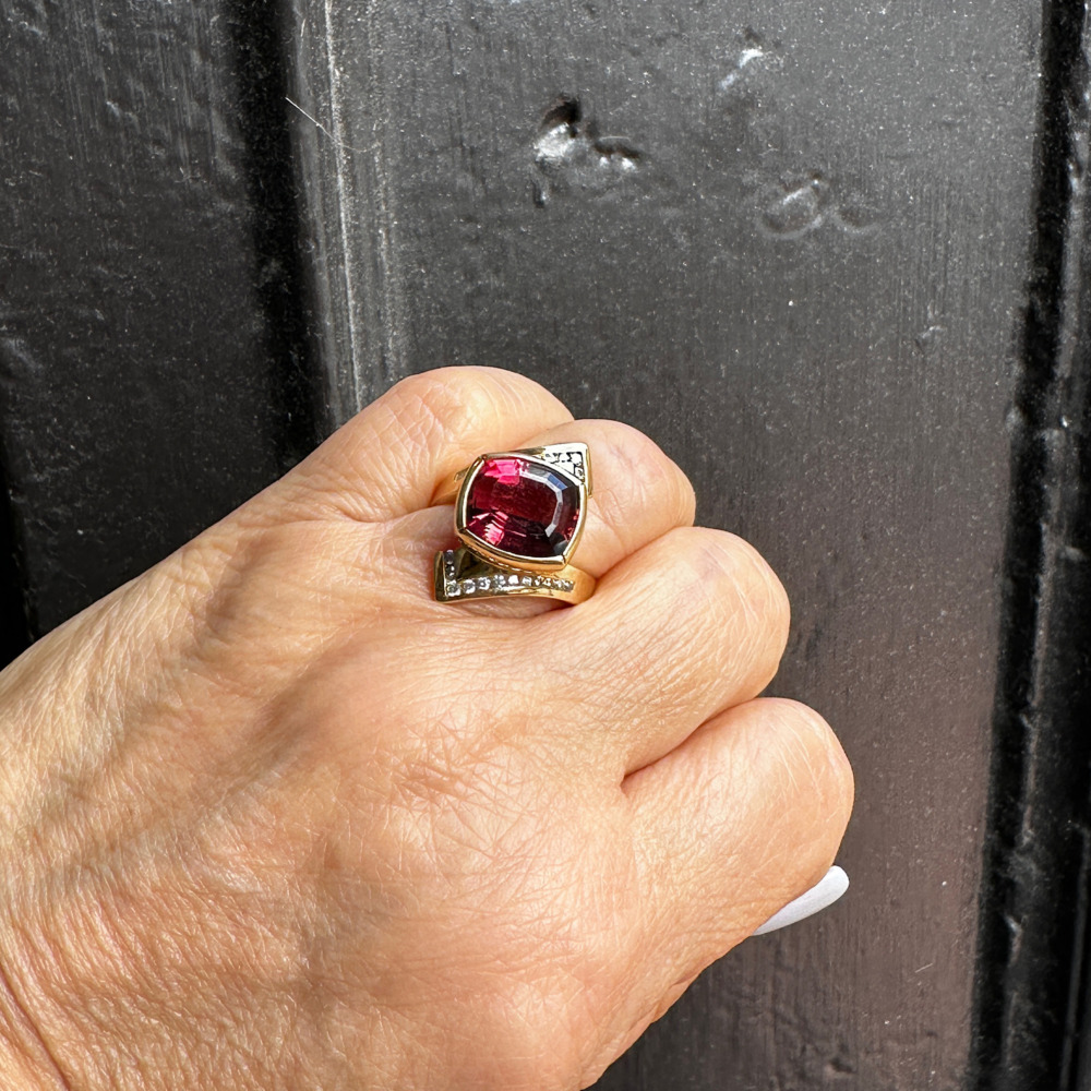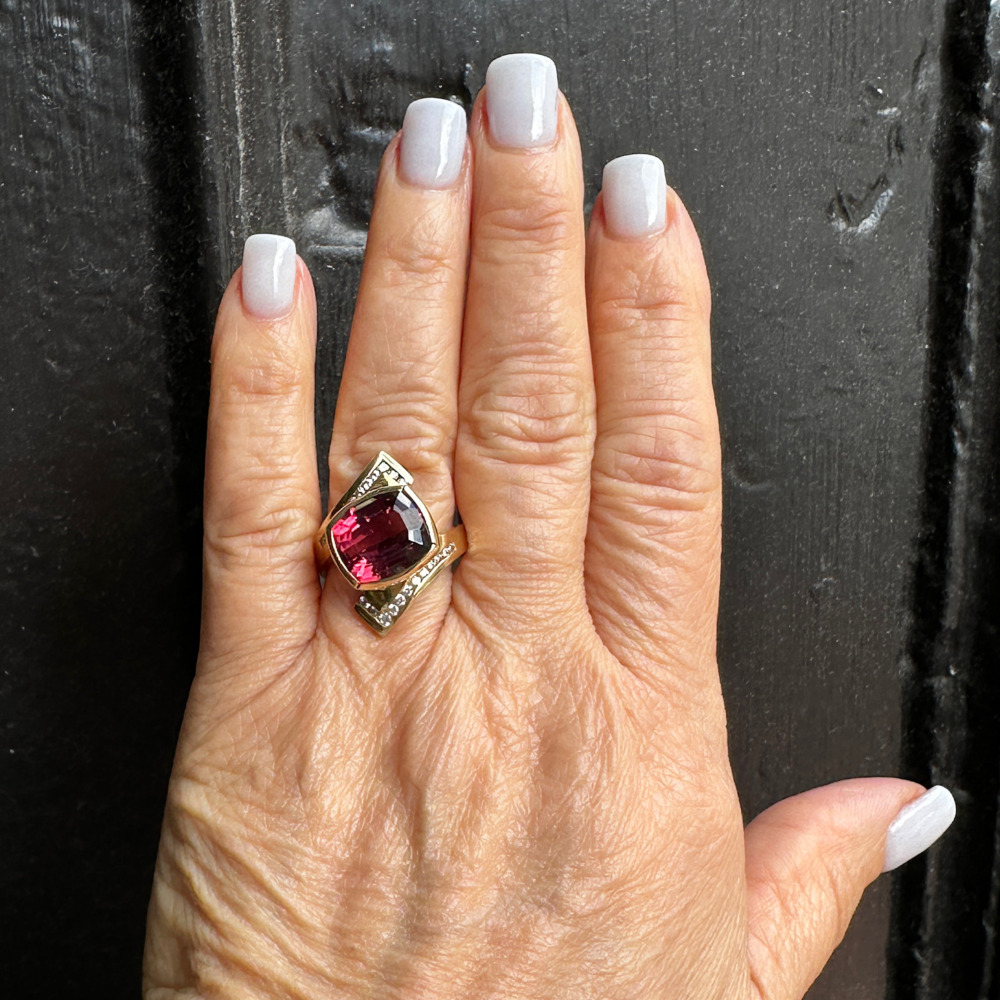 The bypass motif bezel is set with one cushion-cut pink tourmaline, measuring 10 x 12.5 x 7.7mm and weighing approximately 6.98 carats, flanked by 24 small round brilliant-cut diamonds, each weighing approximately 0.48 carats, totaling 7.8 dwts.