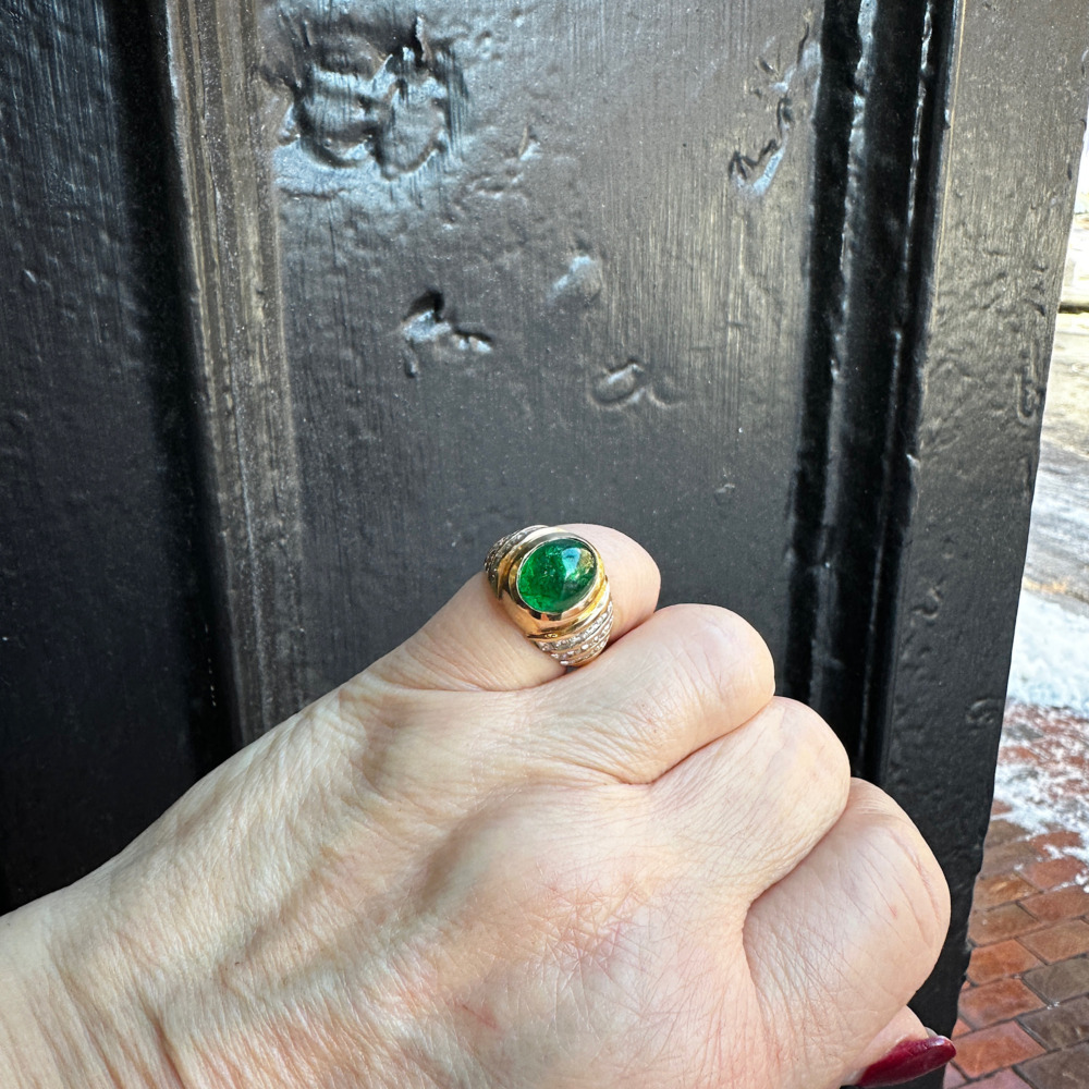 Bezel set with one oval-shaped cabochon cut Ethiopian emerald measuring 11.06 x 8.80 6.46mm, weighing approximately 4.50 carats, flanked by 14 square and 22 round cut diamonds weighing approximately 1.50 carats total.
