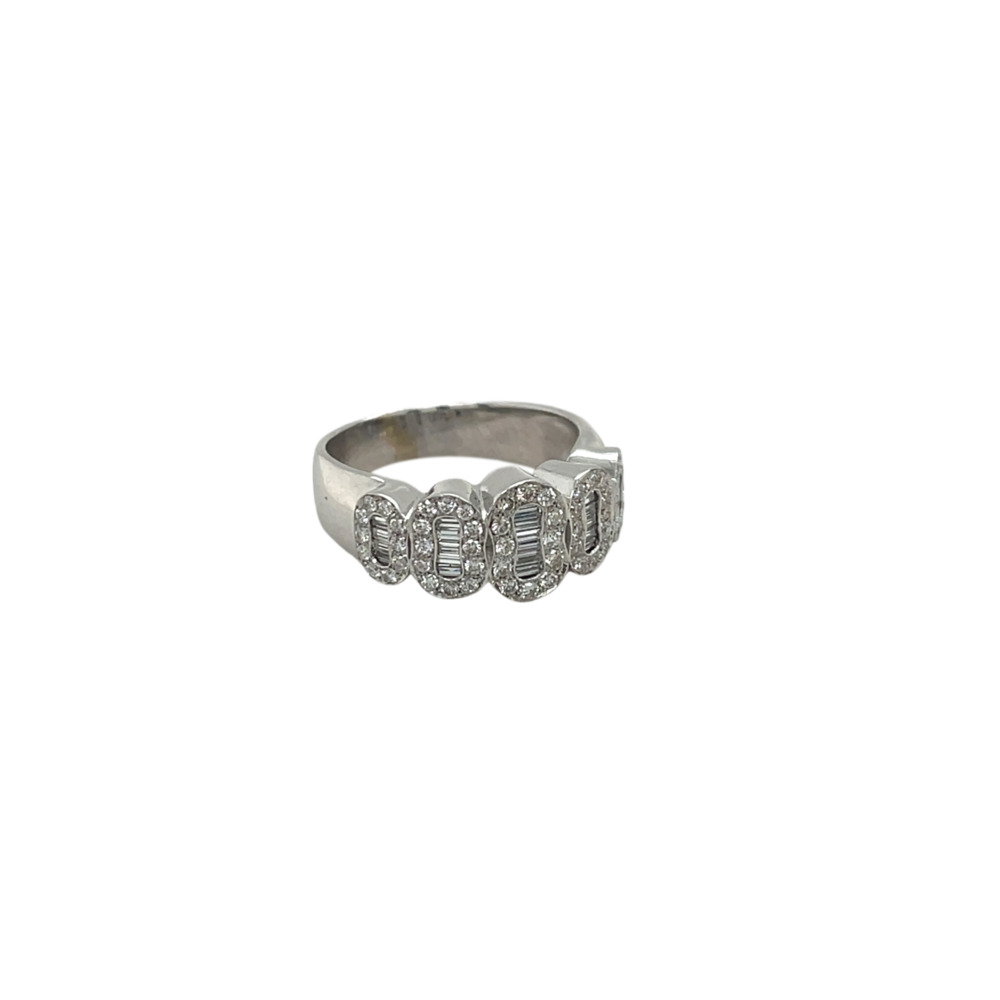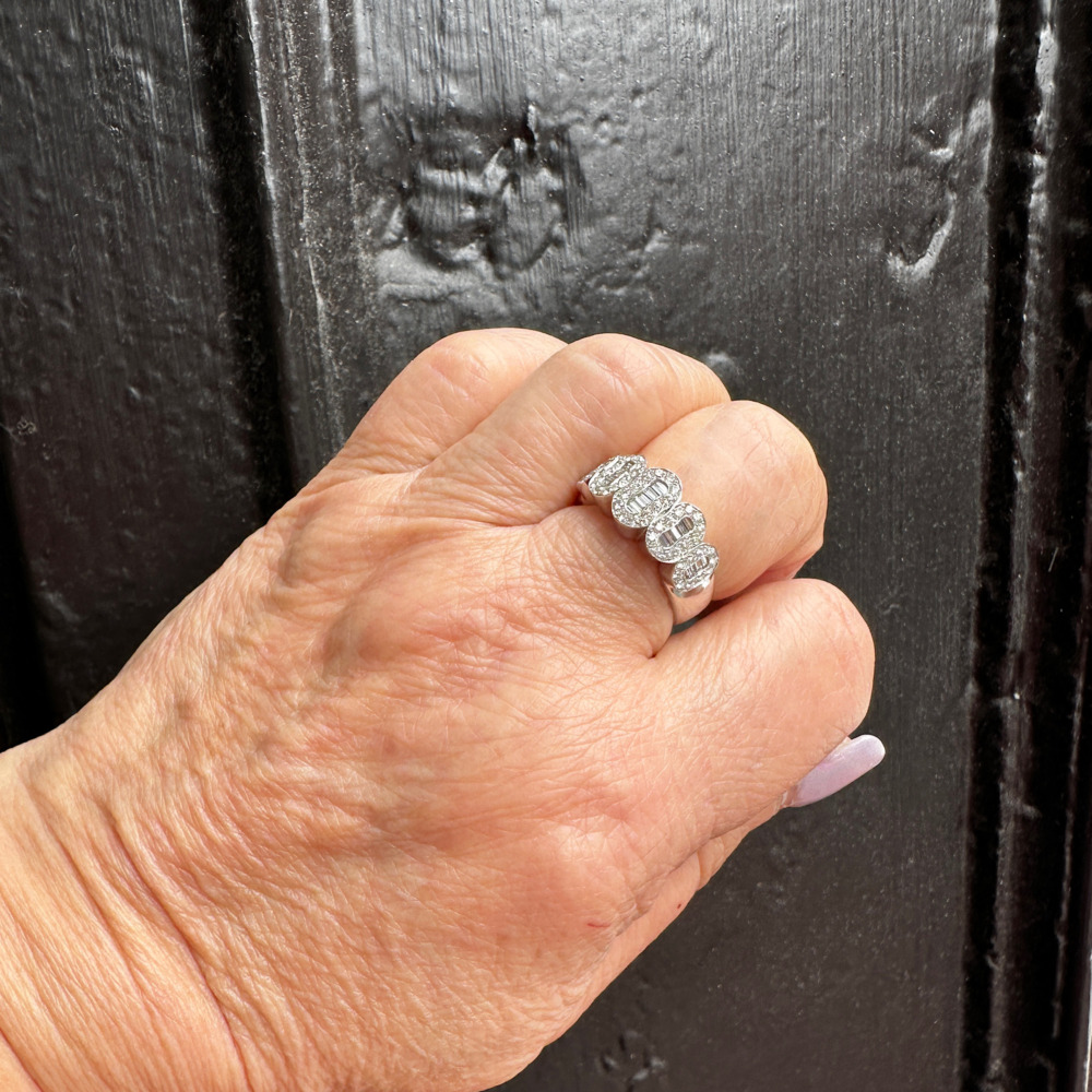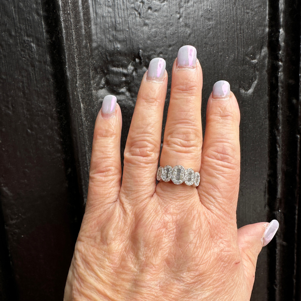 The cluster-style band is composed of 5 oval-shaped clusters set with baguette and round diamonds weighing approximately 1.50 carats total.