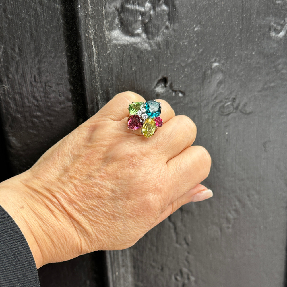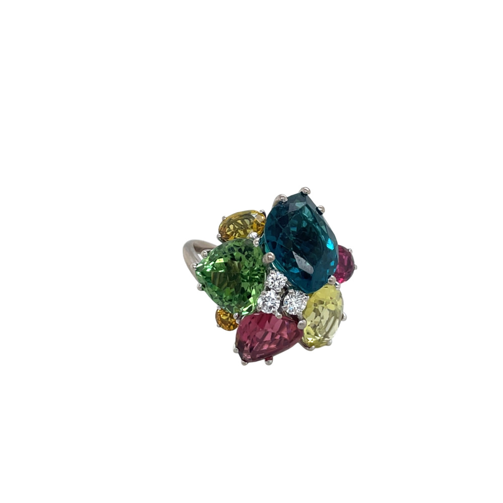 The fancy cluster set with fancy-shaped blue topaz, pink & green tourmaline, zircon, and diamonds weighing approximately 0.38 carat total.