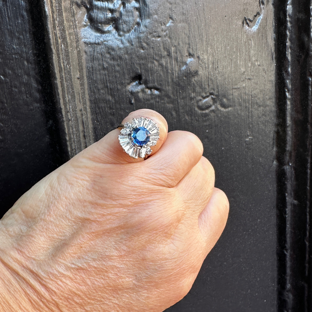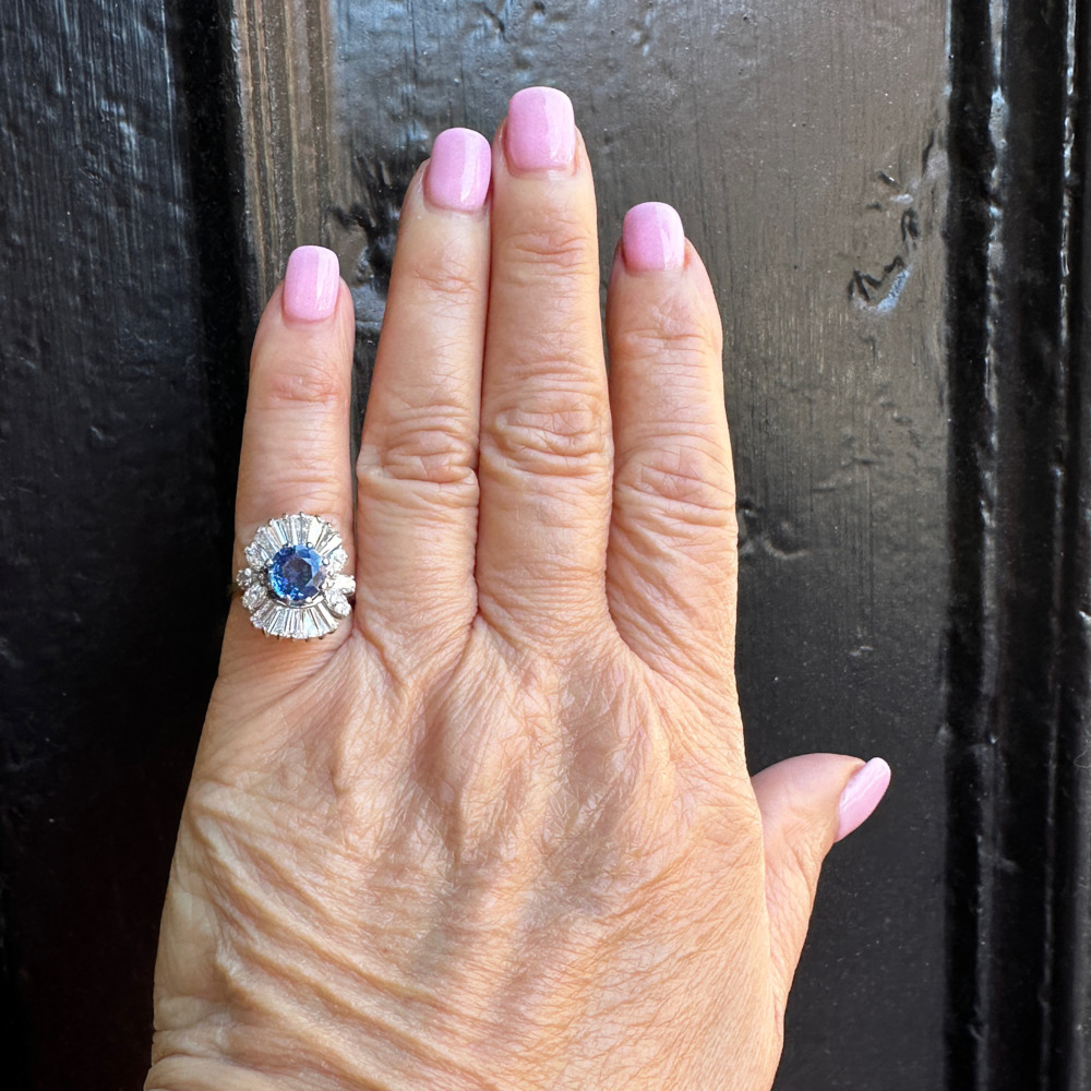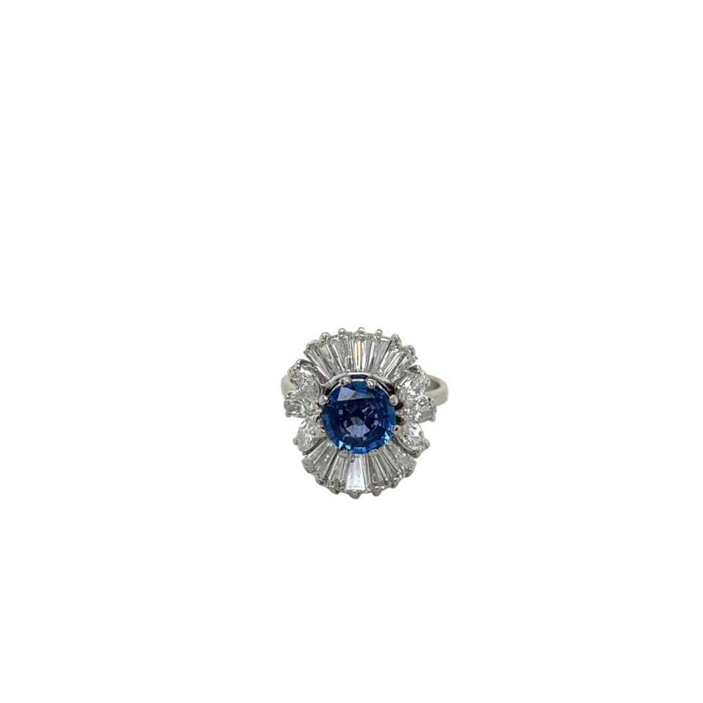 The ballerina-style cluster set with one round sapphire measuring 7.3mm, weighing approximately 1.75 carats, surrounded by baguette and marquise-cut diamonds weighing approximately 1.50 carats.