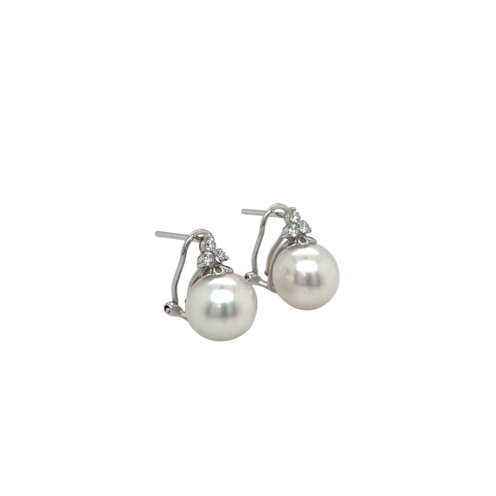 Set with two cultured South Sea pearls measuring 10mm and 6 small round brilliant cut diamonds weighing approximately 0.18 carat total.