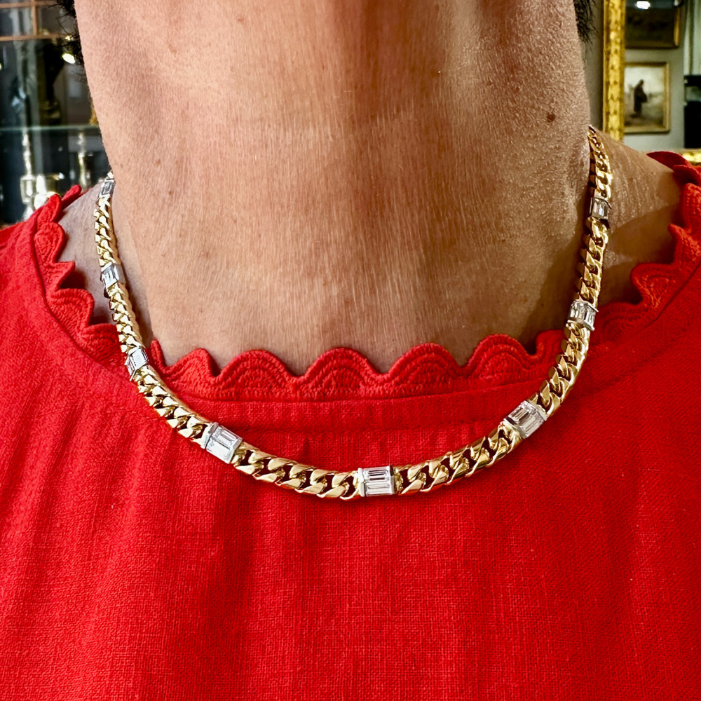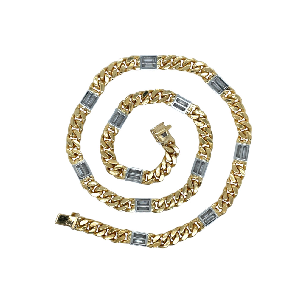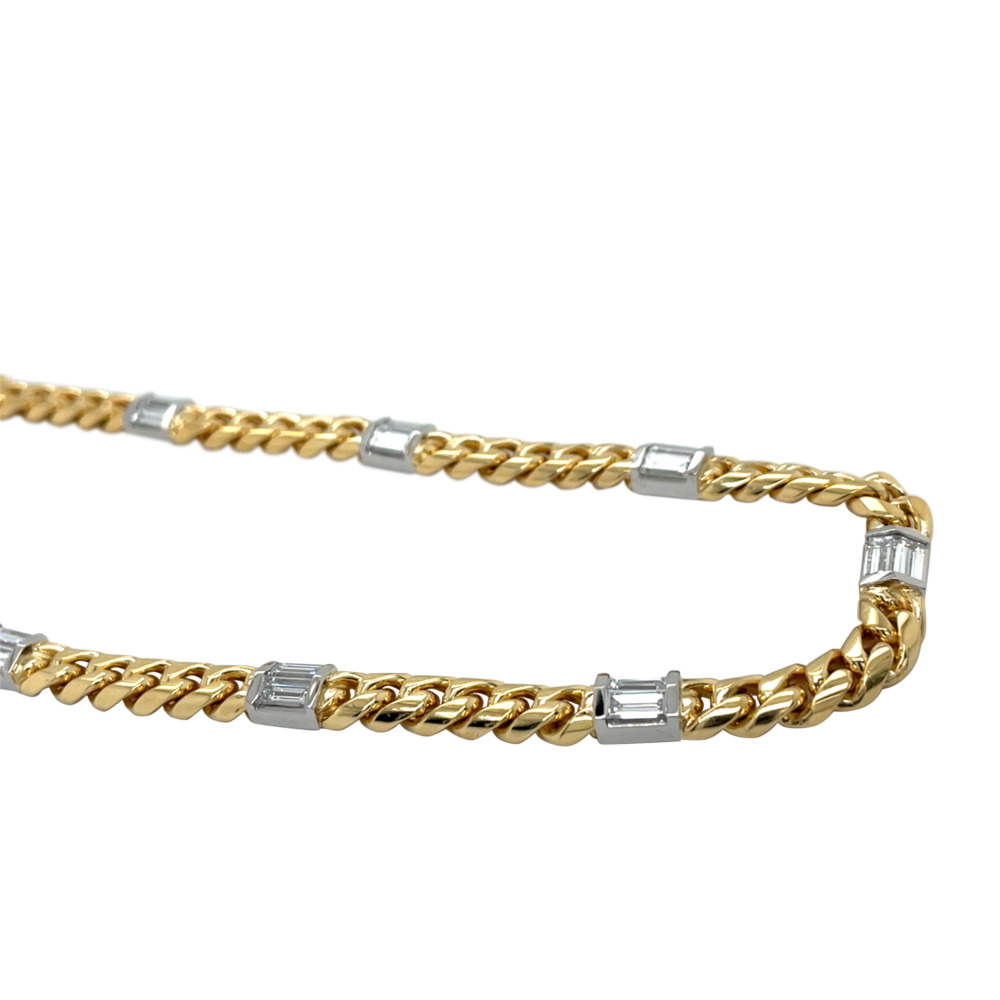 The curb-style link features 13 white gold sections set with 26 baguette-cut diamonds, weighing approximately 7.80 carats in total, and measures 6.0mm in width and 16 inches in length.