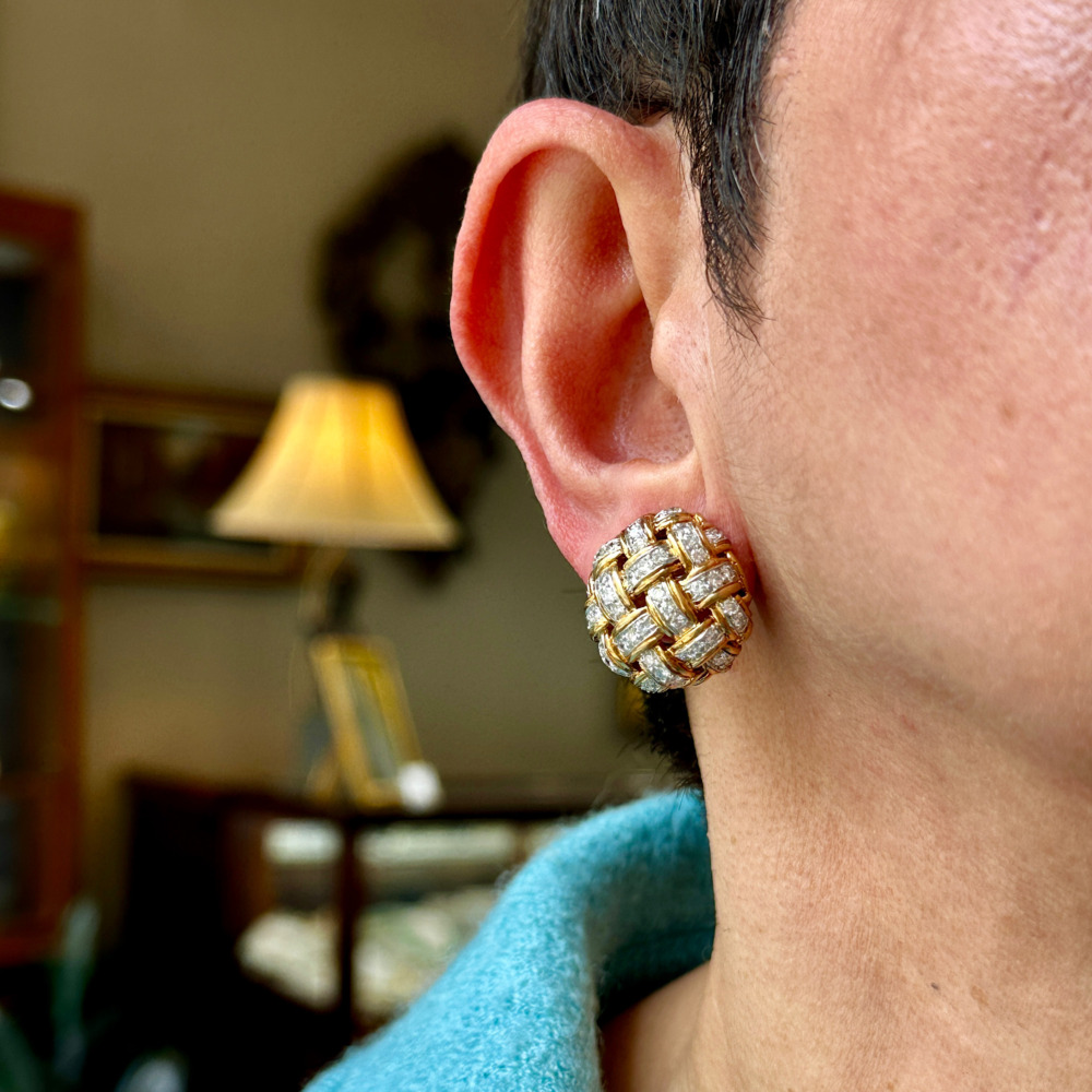 The braided open-work button set features 112 round brilliant cut diamonds, weighing approximately 4.0 carats in total, and measures 21.5mm, weighing 15.6 dwts.