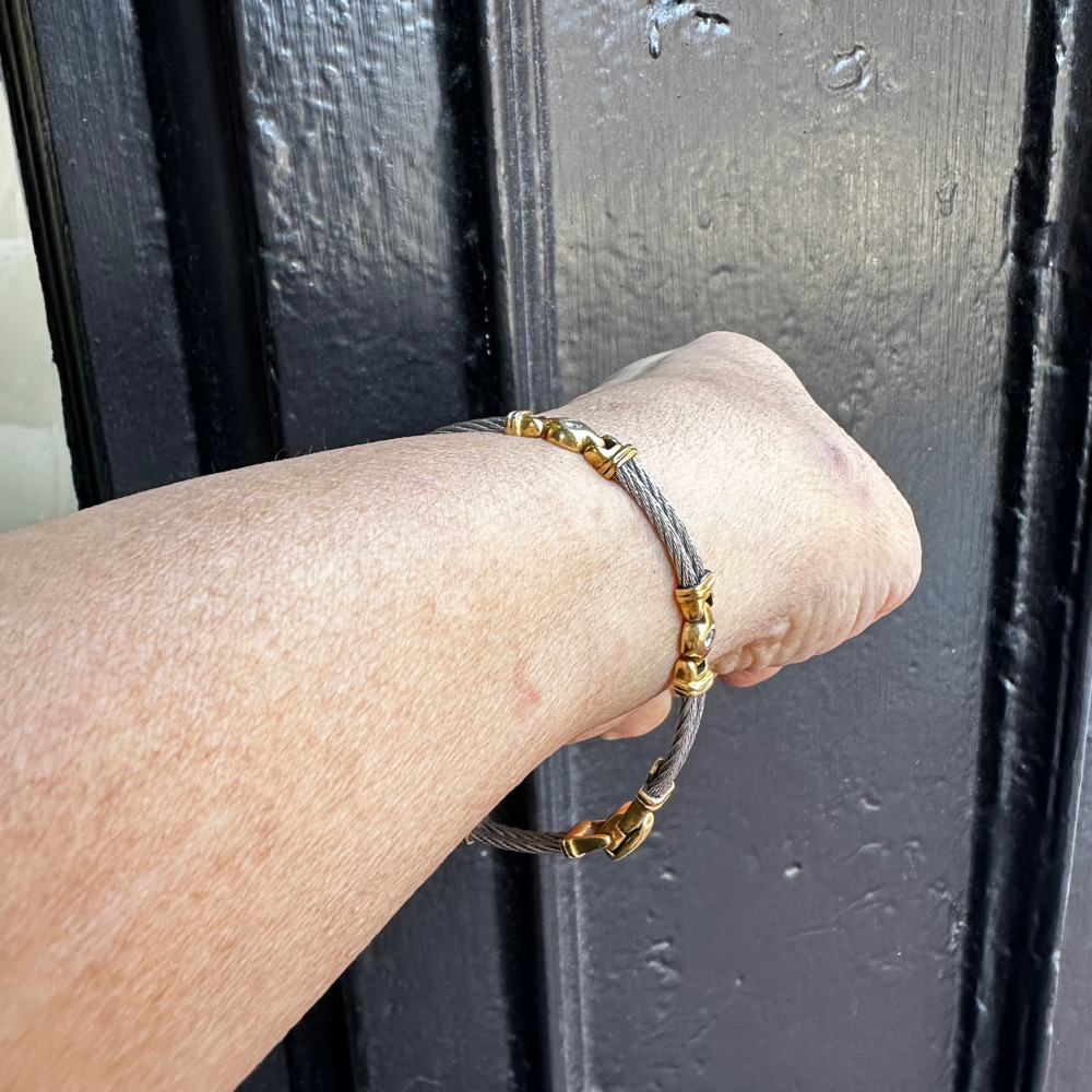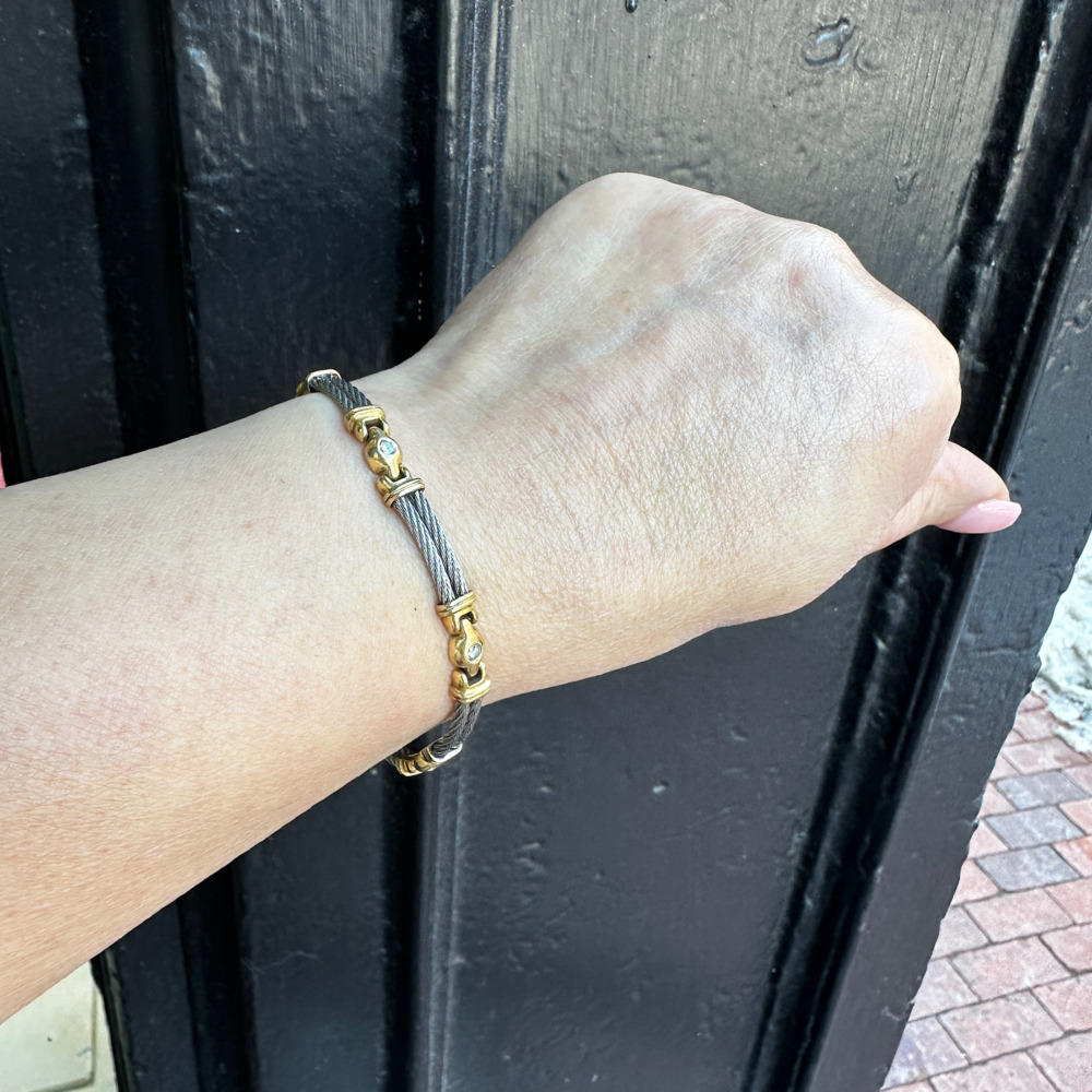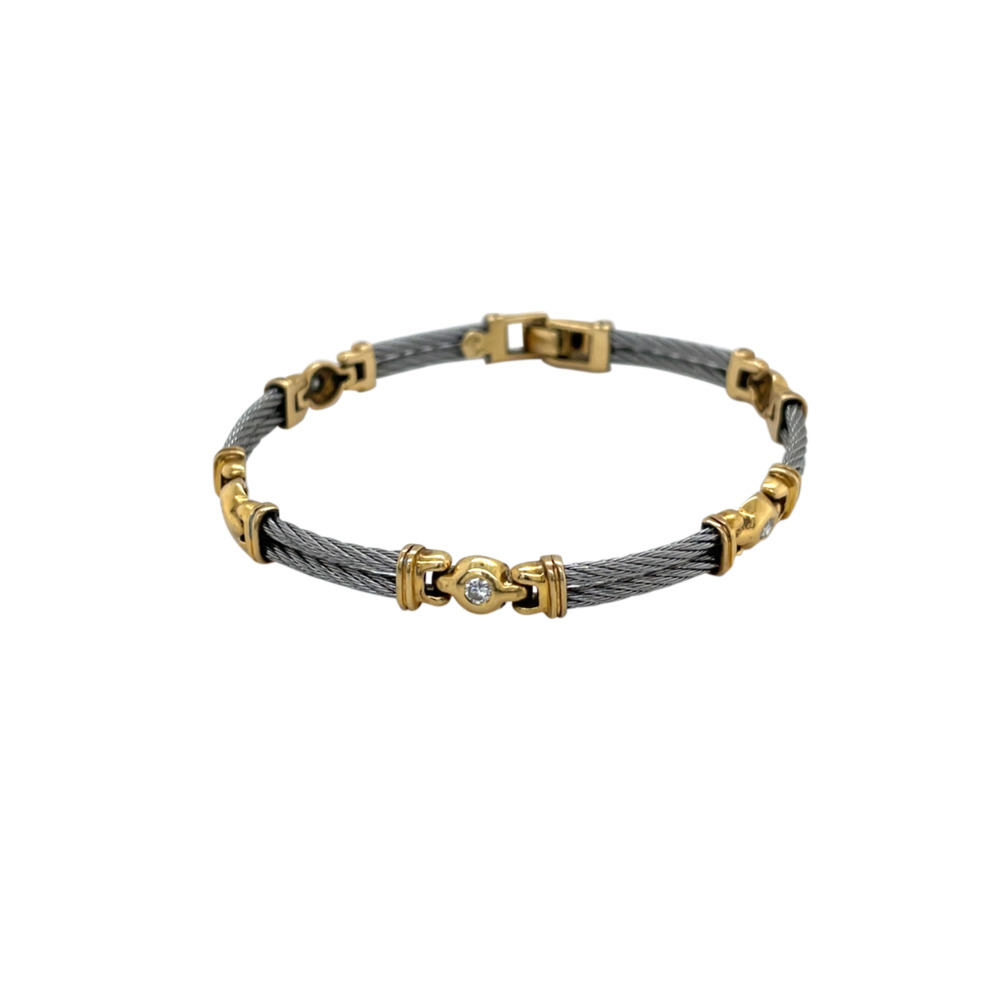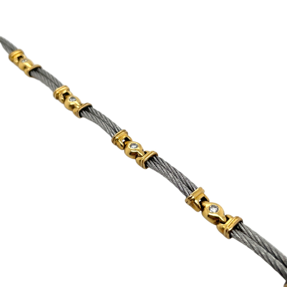 Composed of 6 sections of twisted stainless steel cable connected by a gold section, each set with 5 round brilliant cut diamonds weighing approximately0.40 carat total.