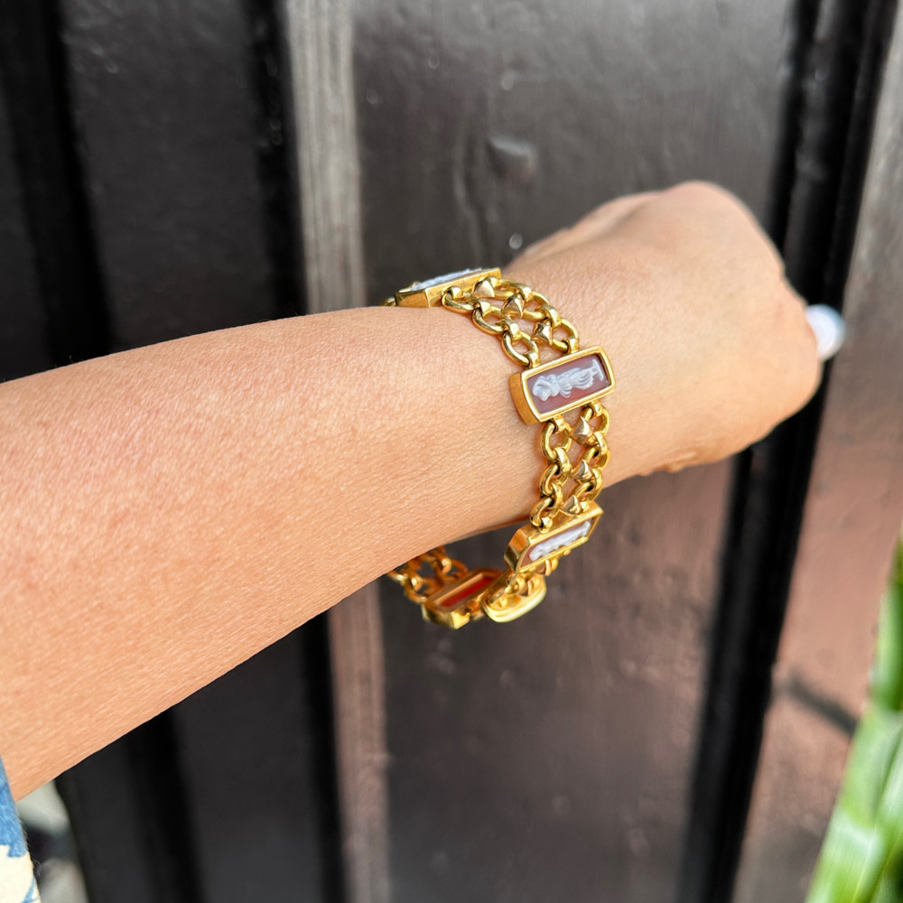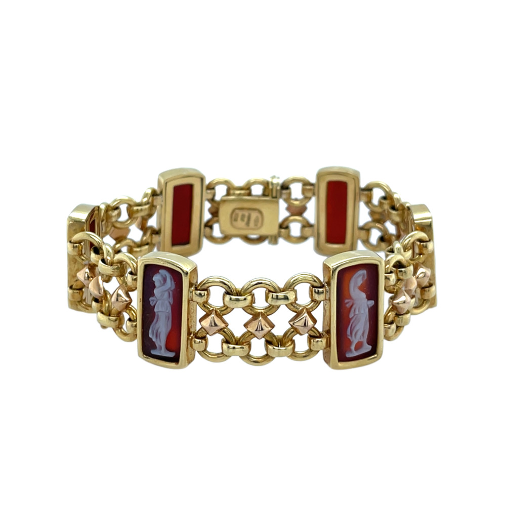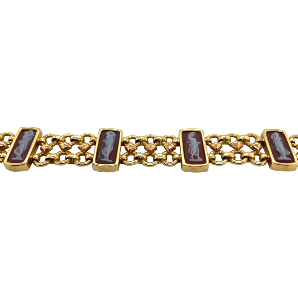 The double row flexible links connecting six rectangular bezels set with shell cameos depicting young ladies.