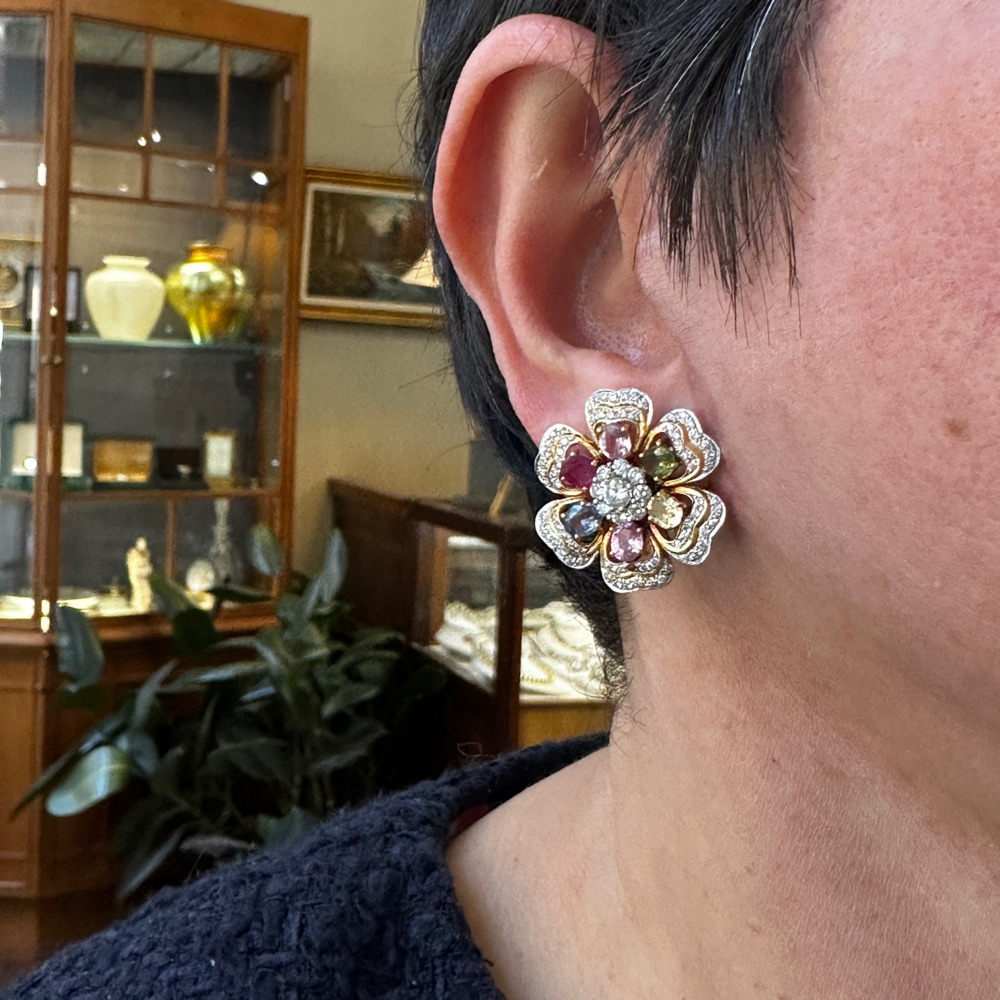 The floral design pavé set features small round brilliant-cut diamonds weighing approximately 2.50 carats total, and 12 oval-shaped sapphires in green, pink, blue, and yellow, weighing approximately 6.0 carats total.