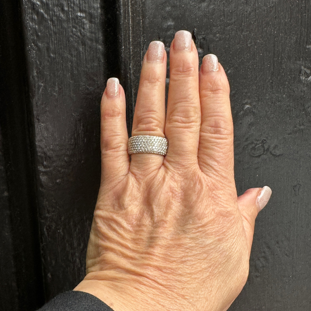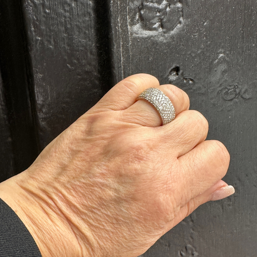 The wide pave style set with small round brilliant cut diamonds weighing approximately 2.40 carats total, measuring 10mm wide.