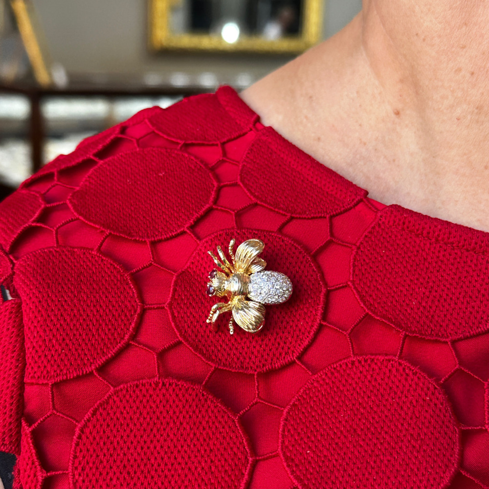 The bee motif brooch is pavé-set with small round diamonds weighing approximately 0.50 carats total.