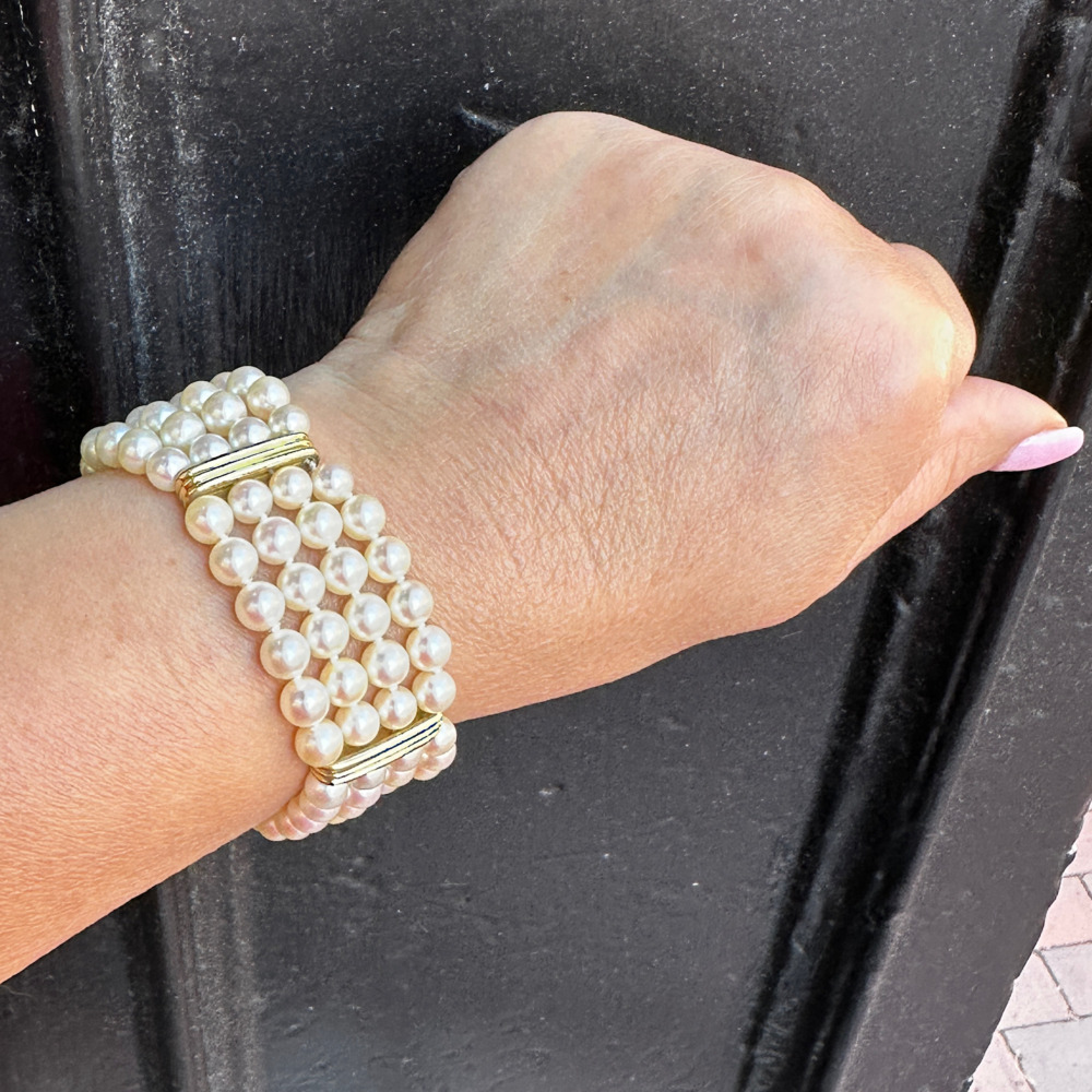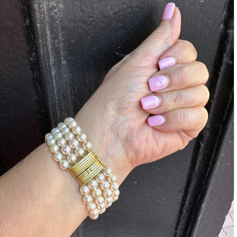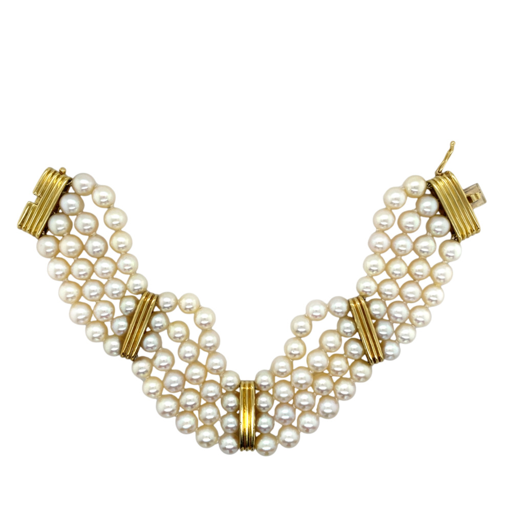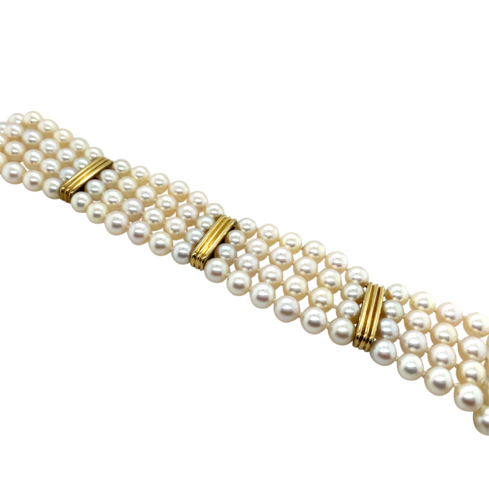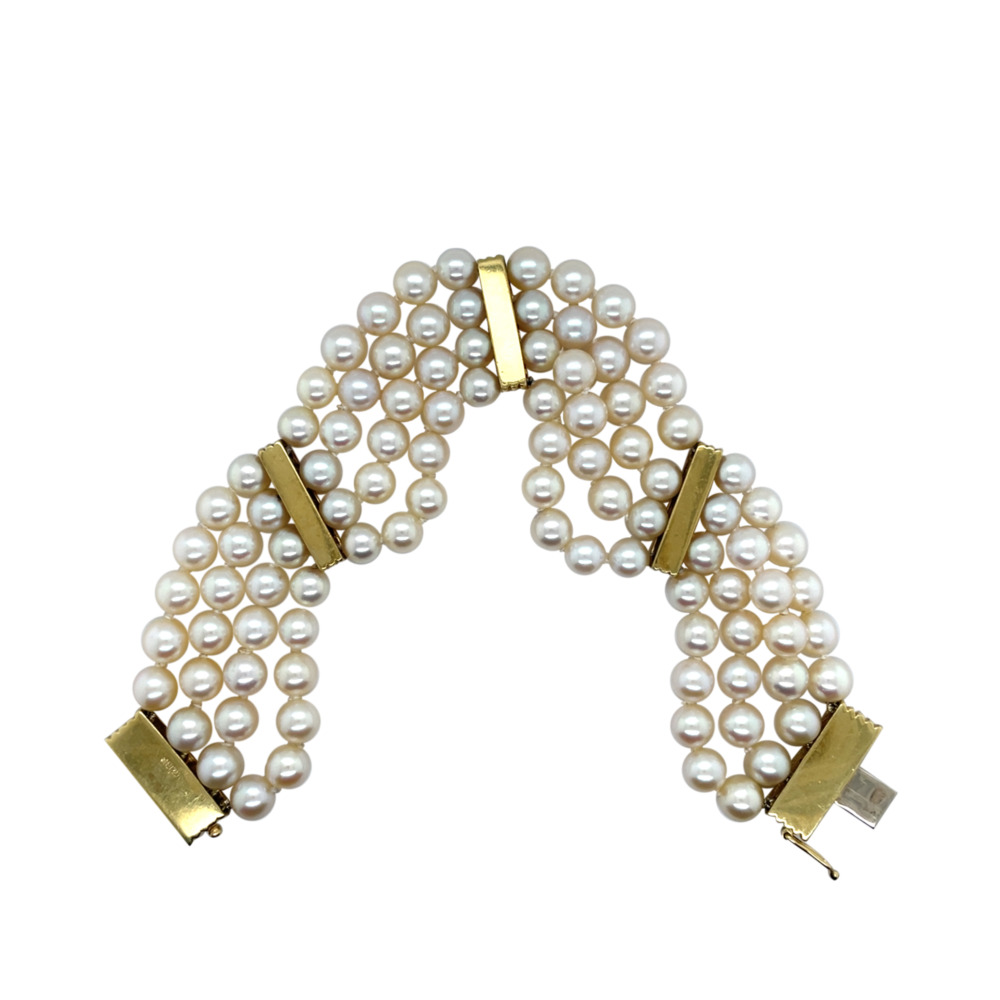 The four-strand style is composed of 96 cultured saltwater pearls measuring 6.2mm, alternating with 3 gold bars, and finished with a gold clasp.