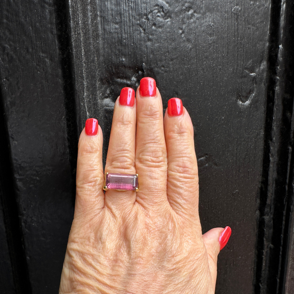Set with one emerald-cut pink tourmaline measuring 9.22 x 17.9 mm, the ring weighs 5.7 dwt.