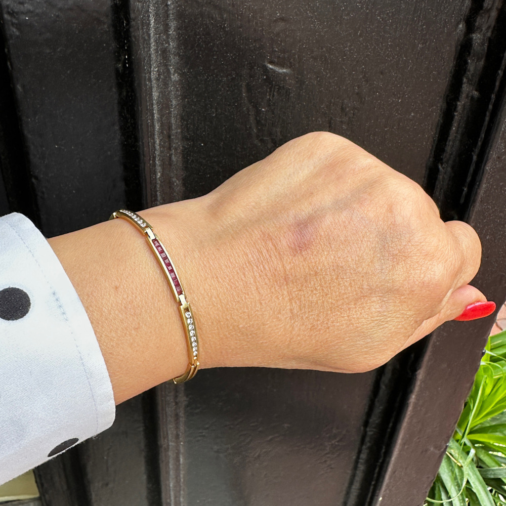 The bar motif is set in the center with eight small square-cut rubies and 16 small round brilliant-cut diamonds, totaling approximately 0.48 carats, measuring 3.4 mm in width, and weighing 6.6 dwts.