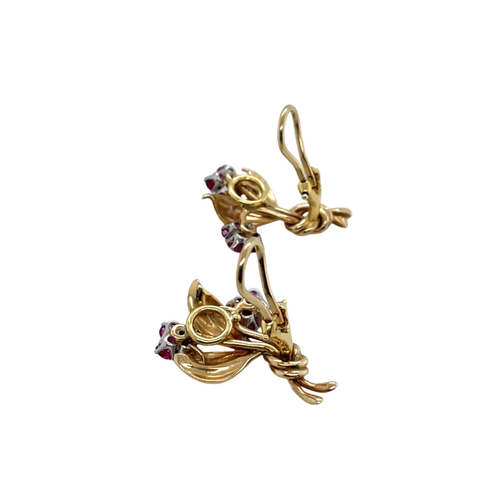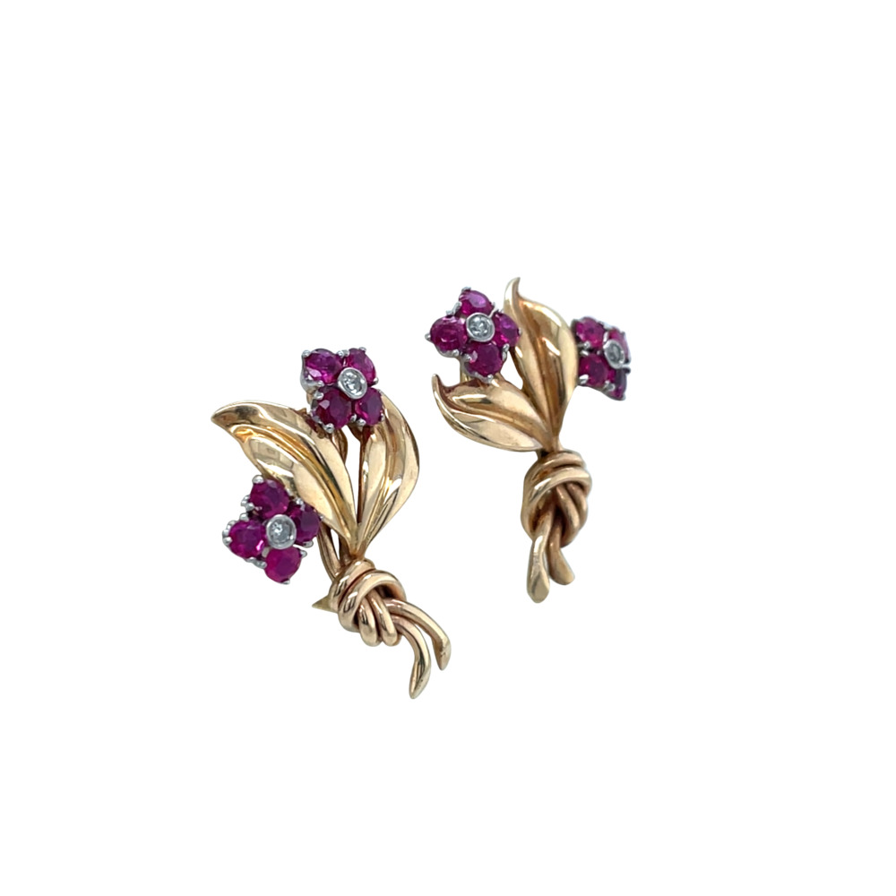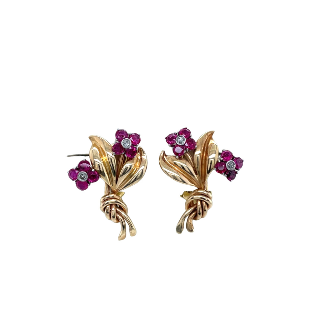 The floral motif cluster is set with small rubies and small round diamonds, measuring 1 inch in length and weighing 5.5 carats.
