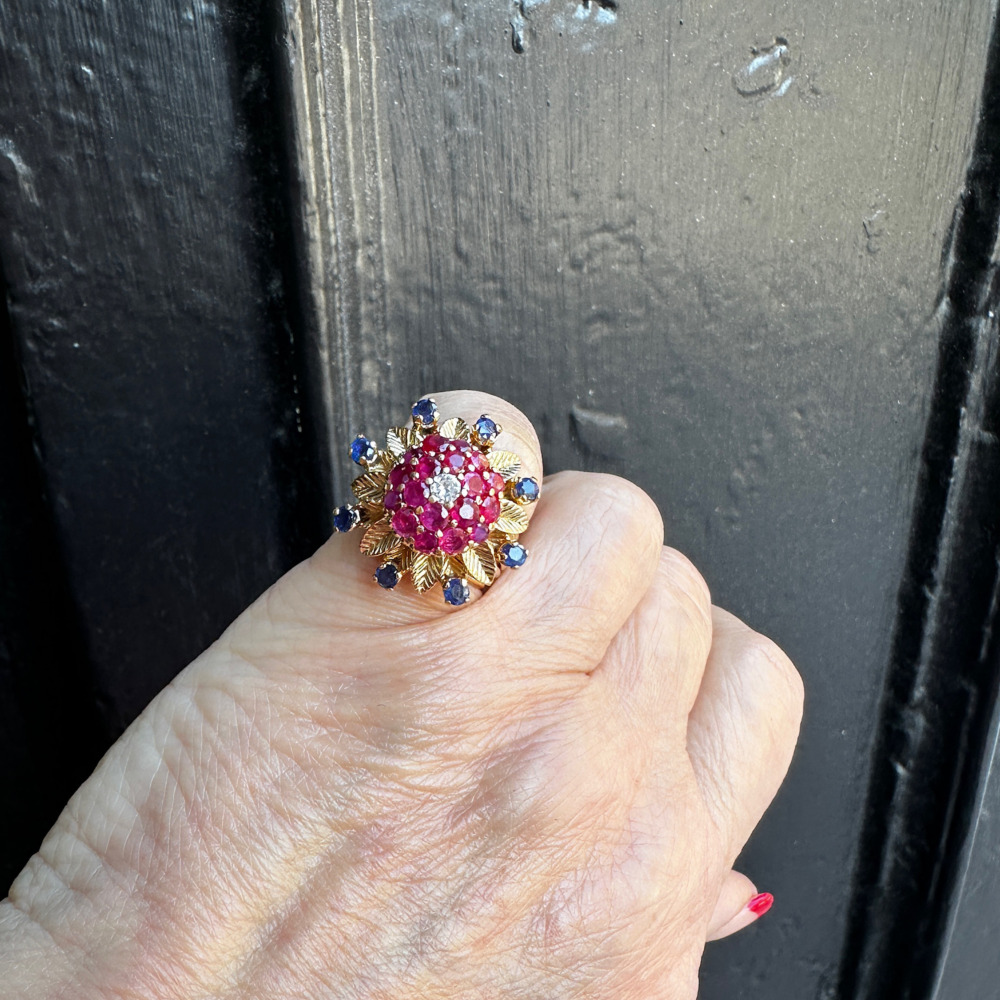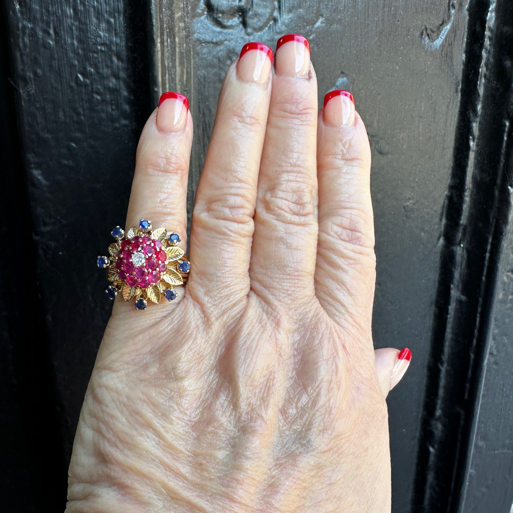 18K Yellow Gold Ruby, Sapphire, and Diamond Ring