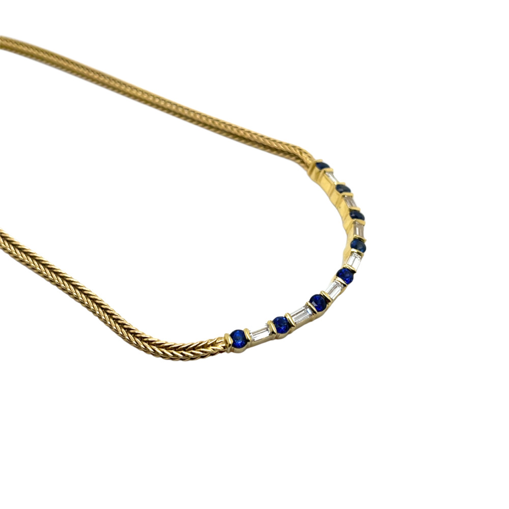 The curved center channel, set with 8 round fine blue sapphires weighing approximately 1.20 carats total, alternating with 7 baguette-cut diamonds weighing approximately 0.80 carats total, measuring 16 inches long.