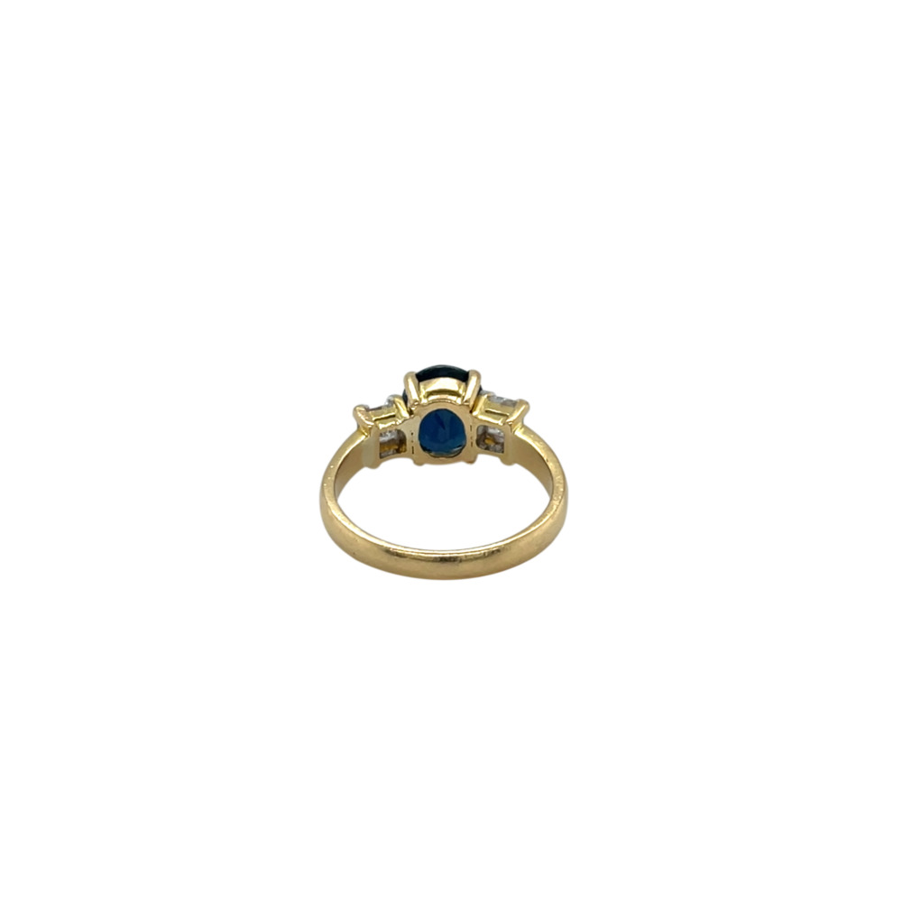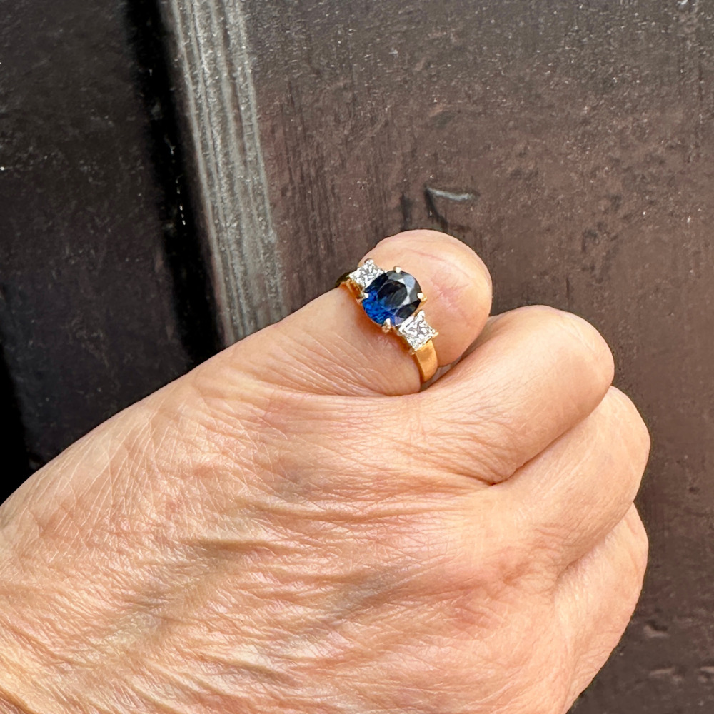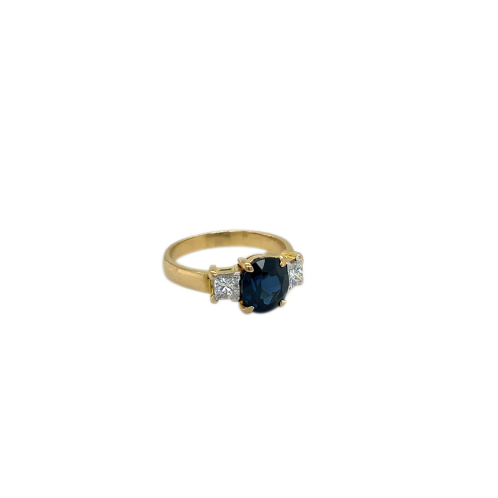 The three-stone style is set with one oval-shaped sapphire weighing approximately 2.30 carats and flanked by two princess-cut diamonds weighing approximately 0.50 carats total.